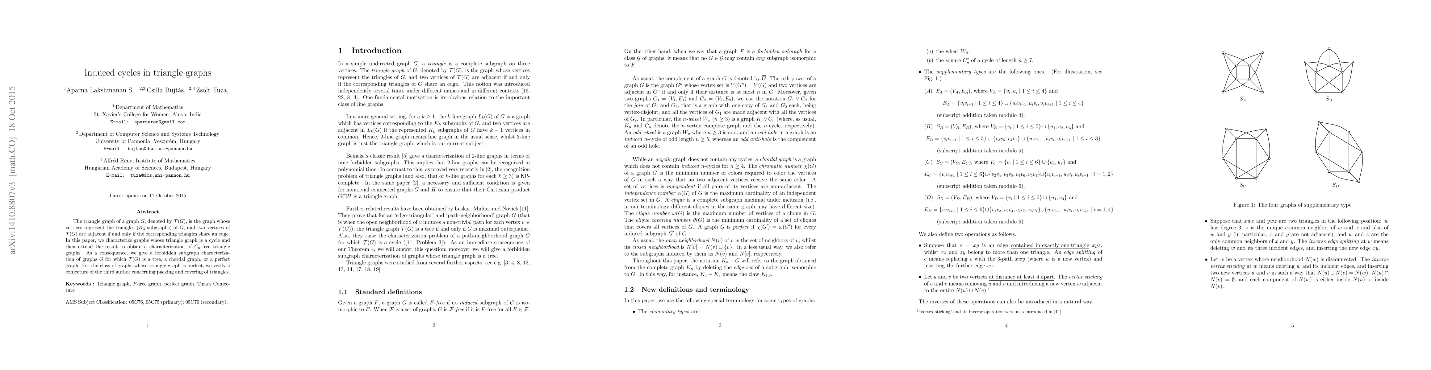 The triangle graph of a graph $G$, denoted by ${\cal T}(G)$, is the graph whose vertices represent the triangles ($K_3$ subgraphs) of $G$, and two vertices of ${\cal T}(G)$ are adjacent if and only if the corresponding triangles share an edge. In this paper, we characterize graphs whose triangle graph is a cycle and then extend the result to obtain a characterization of $C_n$-free triangle graphs. As a consequence, we give a forbidden subgraph characterization of graphs $G$ for which ${\cal T}(G)$ is a tree, a chordal graph, or a perfect graph. For the class of graphs whose triangle graph is perfect, we verify a conjecture of the third author concerning packing and covering of triangles.