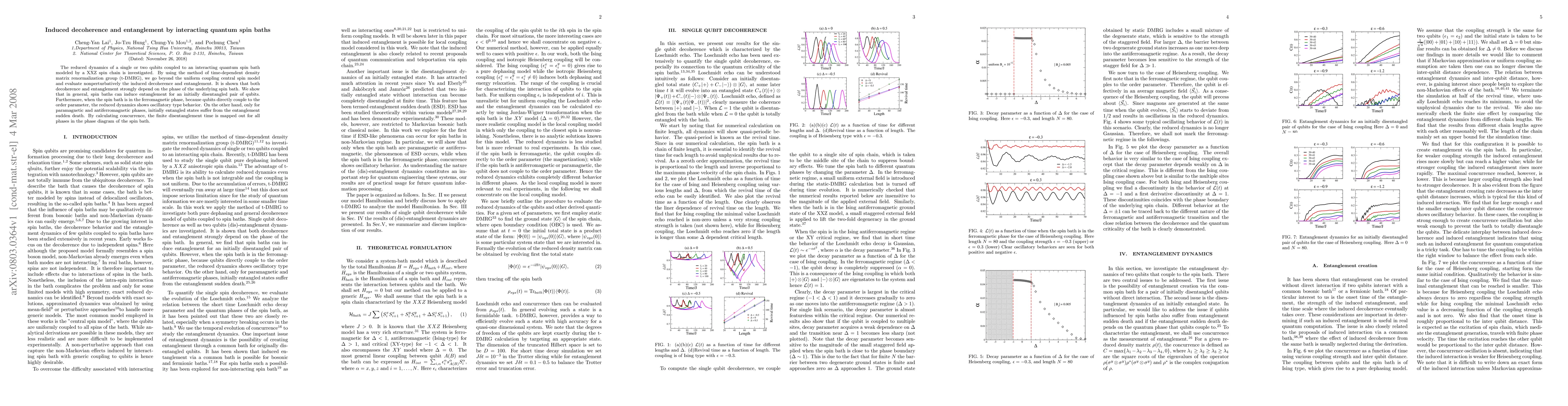 The reduced dynamics of a single or two qubits coupled to an interacting quantum spin bath modeled by a XXZ spin chain is investigated. By using the method of time-dependent density matrix renormalization group (t-DMRG), we go beyond the uniform coupling central spin model and evaluate nonperturbatively the induced decoherence and entanglement. It is shown that both decoherence and entanglement strongly depend on the phase of the underlying spin bath. We show that in general, spin baths can induce entanglement for an initially disentangled pair of qubits. Furthermore, when the spin bath is in the ferromagnetic phase, because qubits directly couple to the order parameter, the reduced dynamics shows oscillatory type behavior. On the other hand, only for paramagnetic and antiferromagnetic phases, initially entangled states suffer from the entanglement sudden death. By calculating concurrence, the finite disentanglement time is mapped out for all phases in the phase diagram of the spin bath.