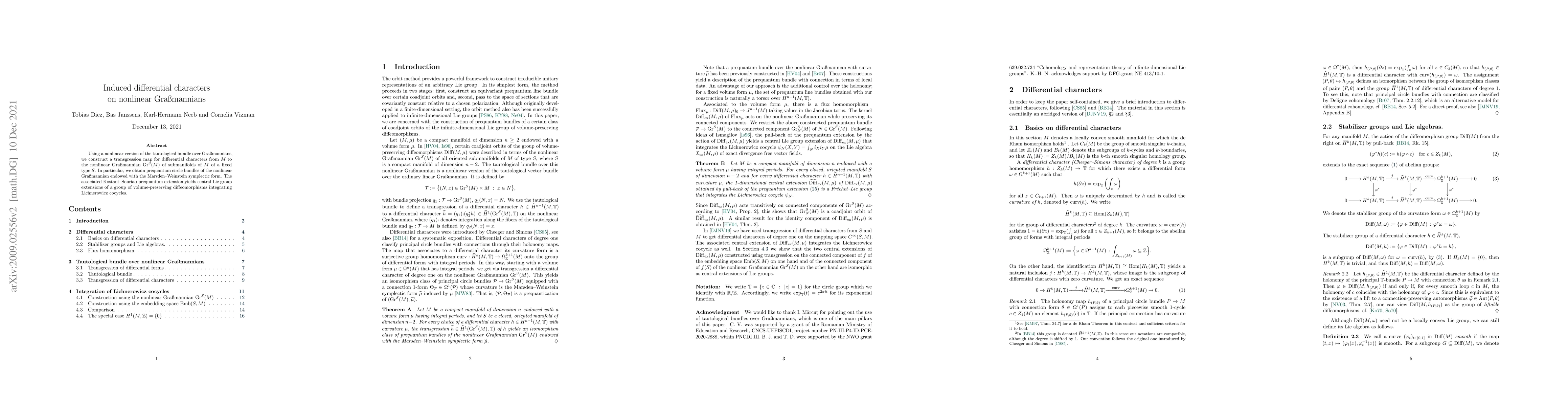 This paper constructs a transgression map for differential characters from $M$ to nonlinear Gra{\ss}mannians $\mathrm{Gr}^S(M)$, obtaining prequantum circle bundles with the Marsden-Weinstein symplectic form, and deriving central Lie group extensions of volume-preserving diffeomorphisms via the Kostant-Souriau prequantum extension.