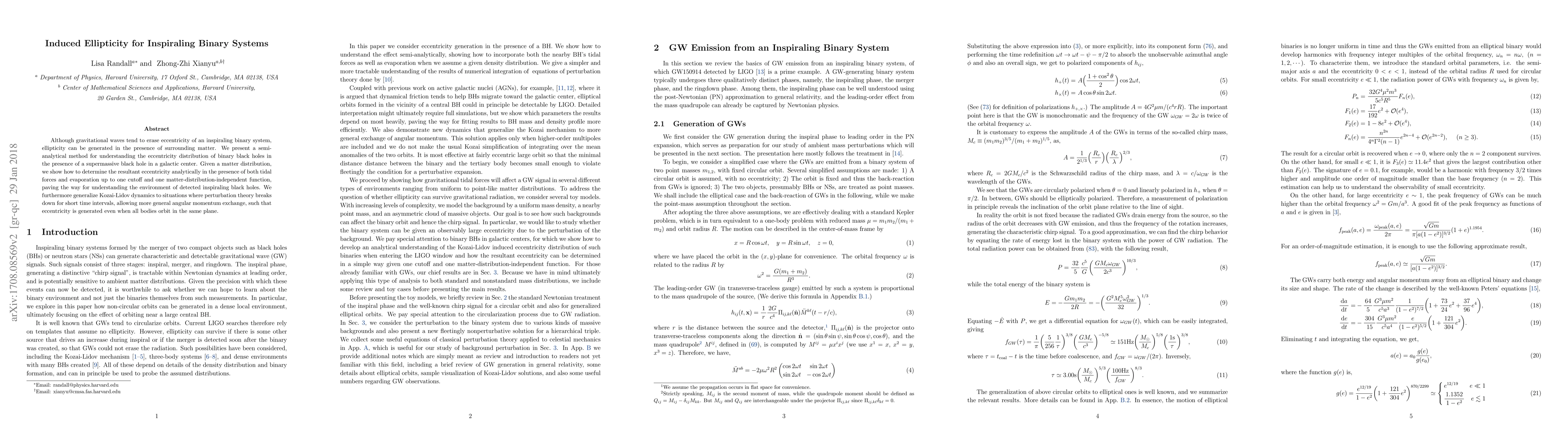 Although gravitational waves tend to erase eccentricity of an inspiraling binary system, ellipticity can be generated in the presence of surrounding matter. We present a semi-analytical method for understanding the eccentricity distribution of binary black holes in the presence of a supermassive black hole in a galactic center. Given a matter distribution, we show how to determine the resultant eccentricity analytically in the presence of both tidal forces and evaporation up to one cutoff and one matter-distribution-independent function, paving the way for understanding the environment of detected inspiraling black holes. We furthermore generalize Kozai-Lidov dynamics to situations where perturbation theory breaks down for short time intervals, allowing more general angular momentum exchange, such that eccentricity is generated even when all bodies orbit in the same plane.