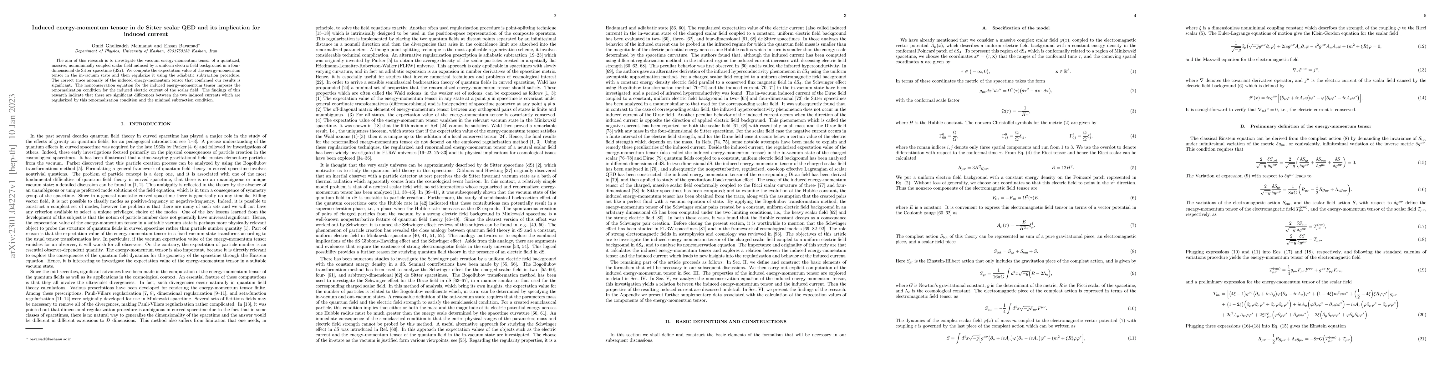 This research investigates the vacuum energy-momentum tensor of a scalar field in de Sitter spacetime under a uniform electric field, revealing significant differences between induced currents regularized by renormalization conditions versus minimal subtraction. The study confirms the correct trace anomaly and nonconservation equation for the tensor.