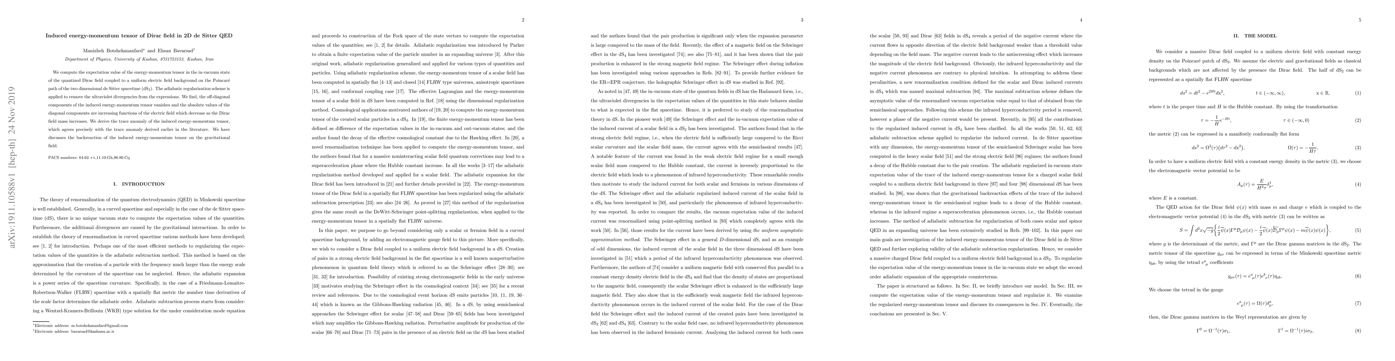 This paper computes the expectation value of the energy-momentum tensor for a Dirac field in 2D de Sitter spacetime under a uniform electric field, finding that off-diagonal components vanish and diagonal components increase with the electric field. The study also confirms the trace anomaly and discusses the gravitational backreaction.