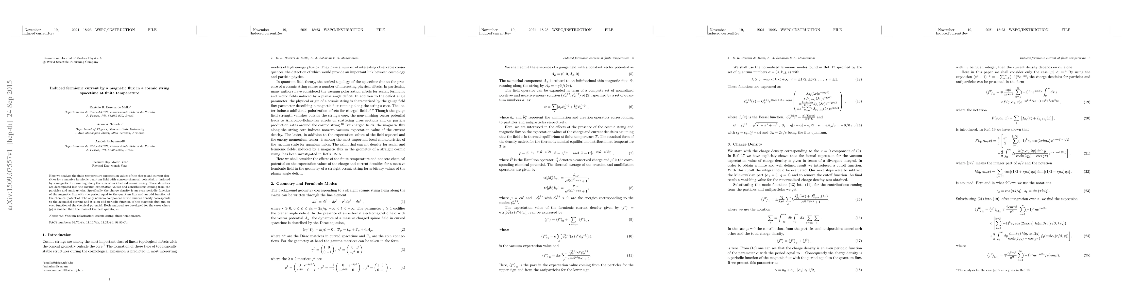 This paper investigates the finite temperature charge and current densities for a massive fermionic quantum field with a chemical potential, induced by a magnetic flux along a cosmic string. The charge density is periodic in magnetic flux and odd in chemical potential, while the azimuthal current density is periodic in flux and even in chemical potential, under conditions where the chemical potential is less than the field's mass.