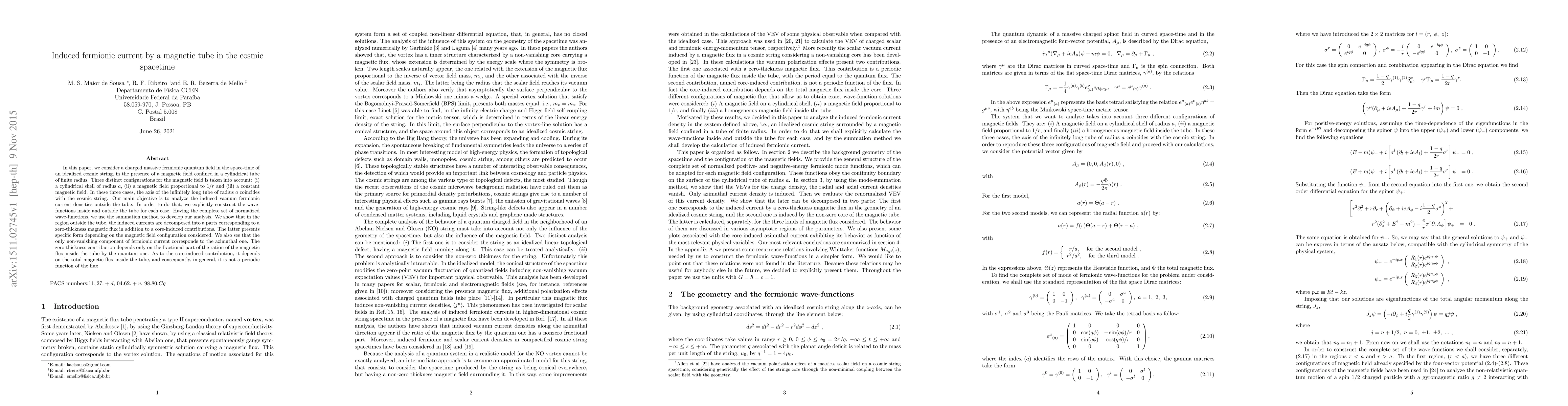 In this paper, we consider a charged massive fermionic quantum field in the space-time of an idealized cosmic string, in the presence of a magnetic field confined in a cylindrical tube of finite radius. Three distinct configurations for the magnetic field is taken into account: (i) a cylindrical shell of radius $a$, (ii) a magnetic field proportional to $1/r$ and (iii) a constant magnetic field. In these three cases, the axis of the infinitely long tube of radius $a$ coincides with the cosmic string. Our main objective is to analyze the induced vacuum fermionic current densities outside the tube. In order to do that, we explicitly construct the wave-functions inside and outside the tube for each case. Having the complete set of normalized wave-functions, we use the summation method to develop our analysis. We show that in the region outside the tube, the induced currents are decomposed into a parts corresponding to a zero-thickness magnetic flux in addition to a core-induced contributions. The latter presents specific form depending on the magnetic field configuration considered. We also see that the only non-vanishing component of fermionic current corresponds to the azimuthal one. The zero-thickness contribution depends only on the fractional part of the ration of the magnetic flux inside the tube by the quantum one. As to the core-induced contribution, it depends on the total magnetic flux inside the tube, and consequently, in general, it is not a periodic function of the flux.