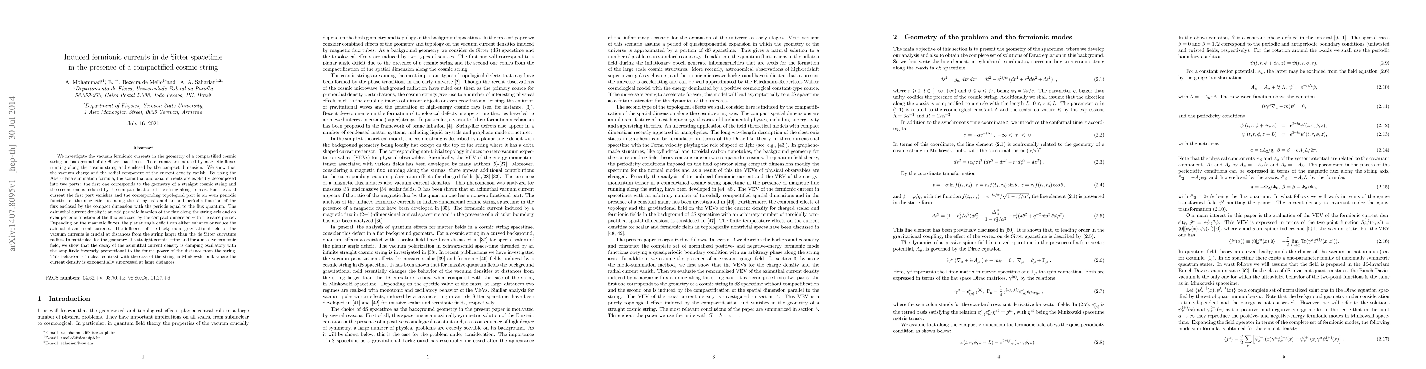 We investigate the vacuum fermionic currents in the geometry of a compactified cosmic string on background of de Sitter spacetime. The currents are induced by magnetic fluxes running along the cosmic string and enclosed by the compact dimension. We show that the vacuum charge and the radial component of the current density vanish. By using the Abel-Plana summation formula, the azimuthal and axial currents are explicitly decomposed into two parts: the first one corresponds to the geometry of a straight cosmic string and the second one is induced by the compactification of the string along its axis. For the axial current the first part vanishes and the corresponding topological part is an even periodic function of the magnetic flux along the string axis and an odd periodic function of the flux enclosed by the compact dimension with the periods equal to the flux quantum. The azimuthal current density is an odd periodic function of the flux along the string axis and an even periodic function of the flux enclosed by the compact dimension with the same period. Depending on the magnetic fluxes, the planar angle deficit can either enhance or reduce the azimuthal and axial currents. The influence of the background gravitational field on the vacuum currents is crucial at distances from the string larger than the de Sitter curvature radius. In particular, for the geometry of a straight cosmic string and for a massive fermionic field, we show that the decay of the azimuthal current density is damping oscillatory with the amplitude inversely proportional to the fourth power of the distance from the string. This behavior is in clear contrast with the case of the string in Minkowski bulk where the current density is exponentially suppressed at large distances.