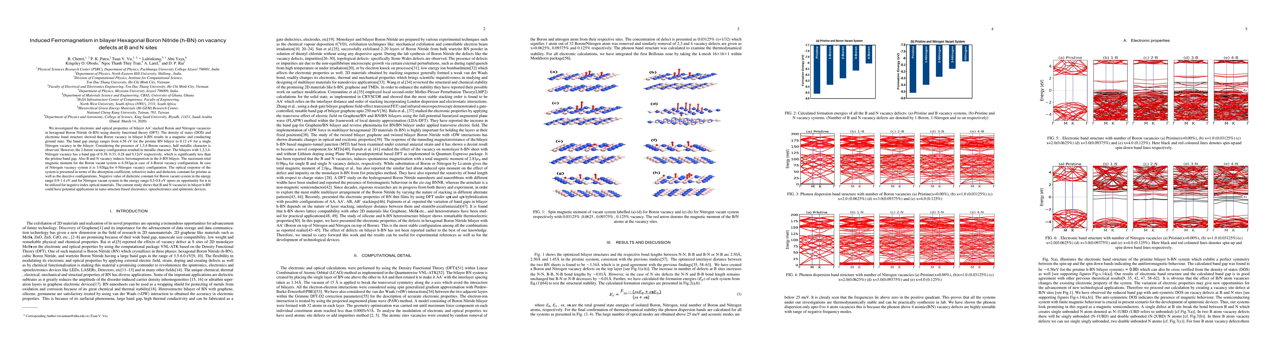 This paper investigates the electronic and optical properties of bilayer hexagonal boron nitride (h-BN) with B and N vacancies using DFT, revealing that vacancies induce ferromagnetism and modify the band gap, with potential applications in nano-electronics, optoelectronics, and spintronics.