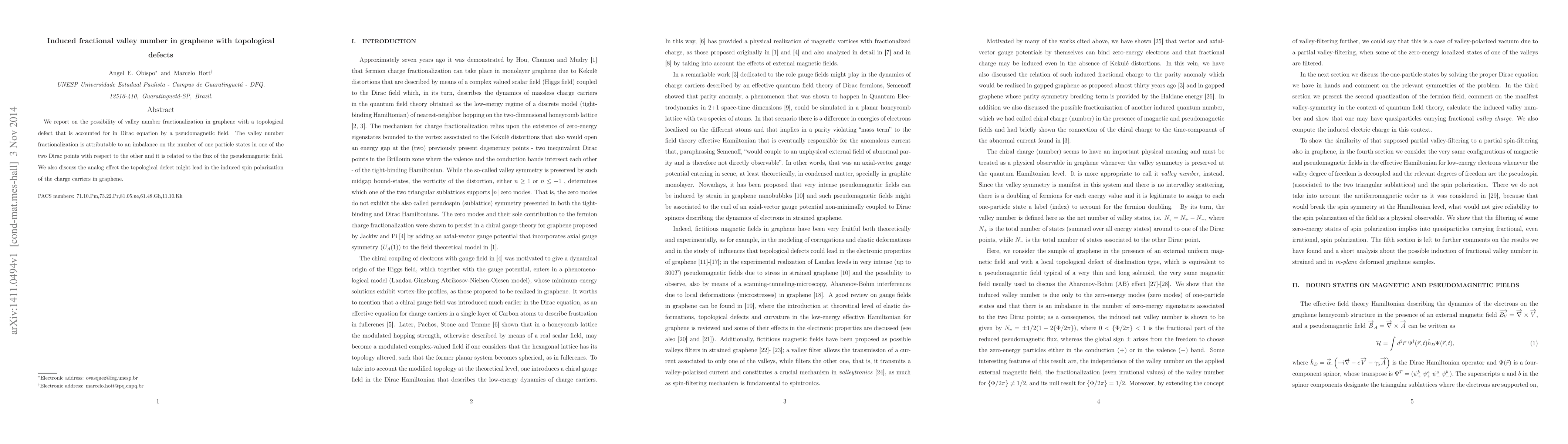 This paper explores the fractionalization of valley number in graphene with a topological defect, modeled through a pseudomagnetic field in the Dirac equation, leading to an imbalance in one-particle states between the two Dirac points. It also examines the potential spin polarization effect induced by such defects.