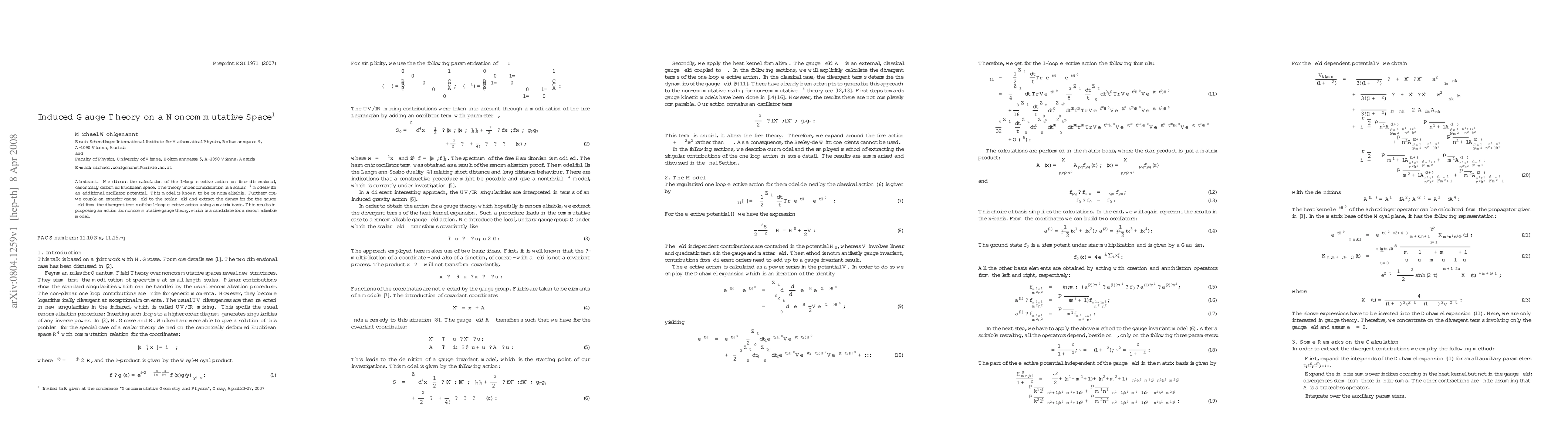 This paper calculates the 1-loop effective action for a renormalizable scalar $\phi^4$ model on noncommutative space, introducing an oscillator potential. It couples an exterior gauge field to the scalar field and derives a candidate action for noncommutative gauge theory from the divergent terms.