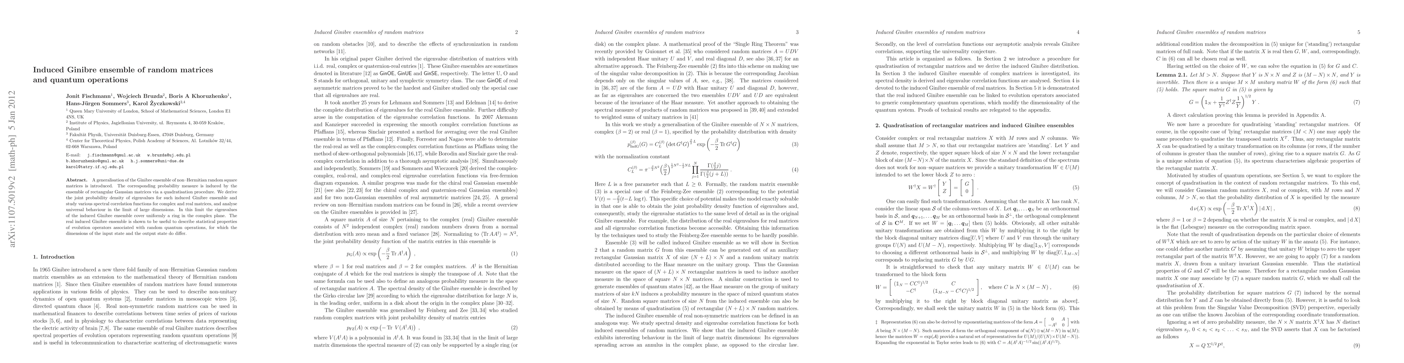 This paper generalizes the Ginibre ensemble of non-Hermitian random matrices and introduces an induced Ginibre ensemble derived from rectangular Gaussian matrices. It analyzes the spectral properties and universal behavior in large dimensions, revealing uniform eigenvalue distribution in a complex plane ring. The real induced Ginibre ensemble is applied to describe statistical properties of quantum operations where input and output state dimensions differ.