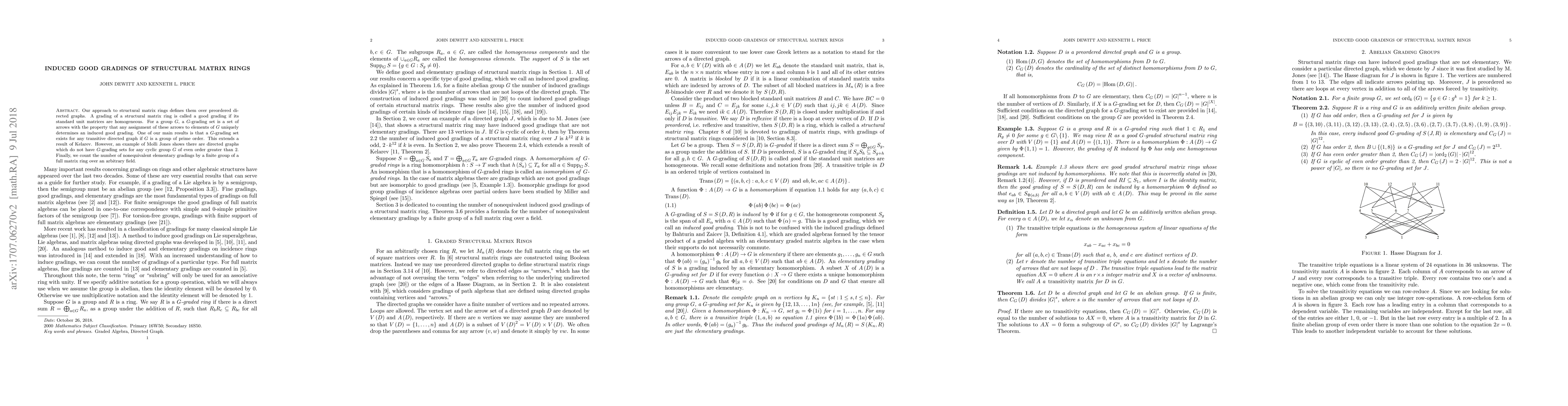 Our approach to structural matrix rings defines them over preordered directed graphs. A grading of a structural matrix ring is called a good grading if its standard unit matrices are homogeneous. For a group $G$, a $G$ -grading set is a set of arrows with the property that any assignment of these arrows to elements of $G$ uniquely determines an induced good grading. One of our main results is that a $G$-grading set exists for any transitive directed graph if $G$ is a group of prime order. This extends a result of Kelarev. However, an example of Molli Jones shows there are directed graphs which do not have $G$-grading sets for any cyclic group $G$ of even order greater than 2. Finally, we count the number of nonequivalent elementary gradings by a finite group of a full matrix ring over an arbitrary field.