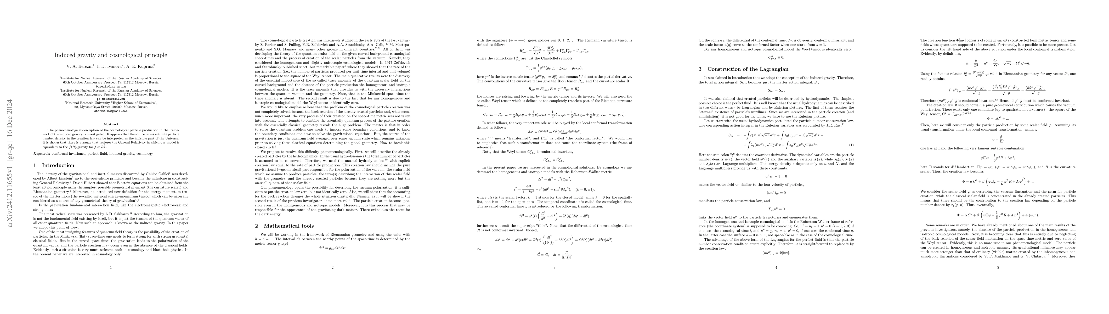 This research explores how cosmological particle production can be described using induced gravity, revealing that particle number density terms represent the invisible part of the Universe. It demonstrates that a specific gauge restores General Relativity, aligning the model with $f(R)$-gravity for $f \propto R^{\frac{3}{2}}$.