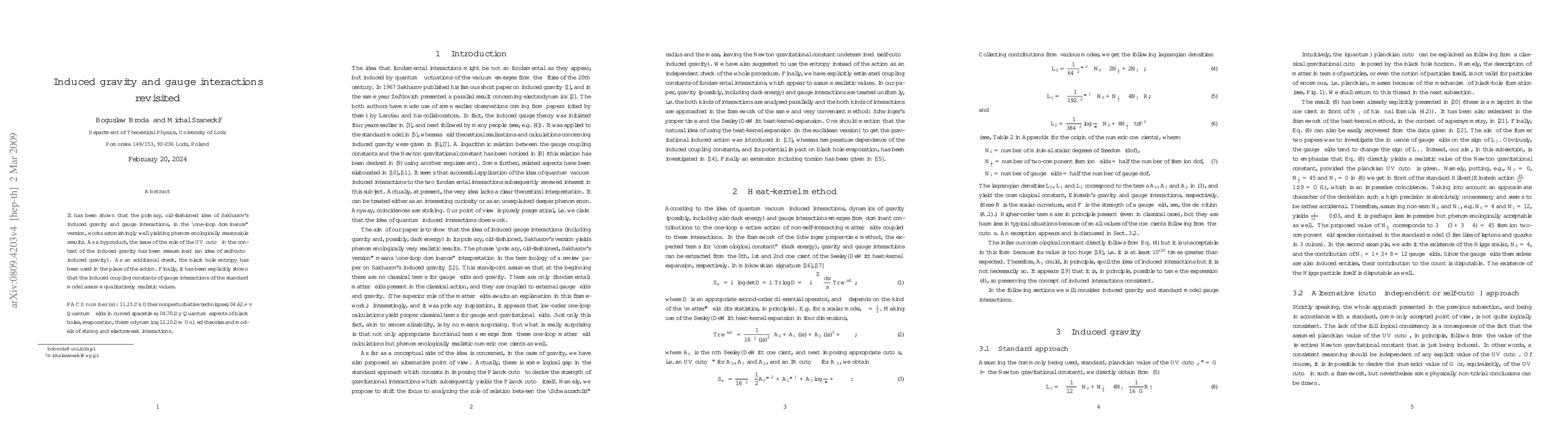 It has been shown that the primary, old-fashioned idea of Sakharov's induced gravity and gauge interactions, in the "one-loop dominance" version, works astonishingly well yielding phenomenologically reasonable results. As a byproduct, the issue of the role of the UV cutoff in the context of the induced gravity has been reexamined (an idea of self-cutoff induced gravity). As an additional check, the black hole entropy has been used in the place of the action. Finally, it has been explicitly shown that the induced coupling constants of gauge interactions of the standard model assume qualitatively realistic values.