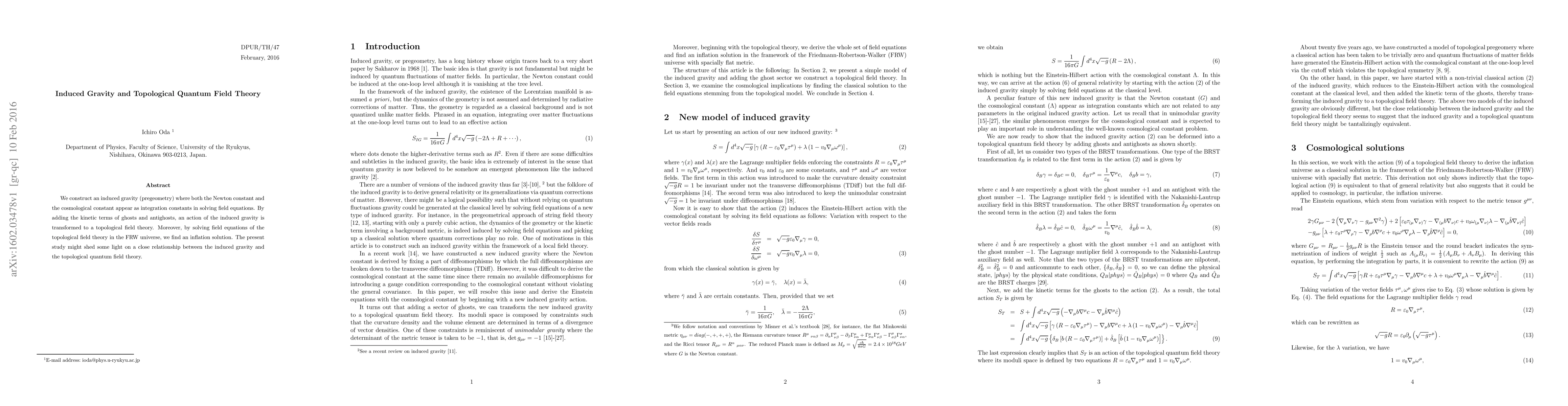 This paper constructs an induced gravity framework where both the Newton constant and cosmological constant emerge from field equations, transforming the action into a topological quantum field theory by incorporating ghost and antighost kinetic terms. The study reveals an inflationary solution in the FRW universe, suggesting a potential link between induced gravity and topological quantum field theory.