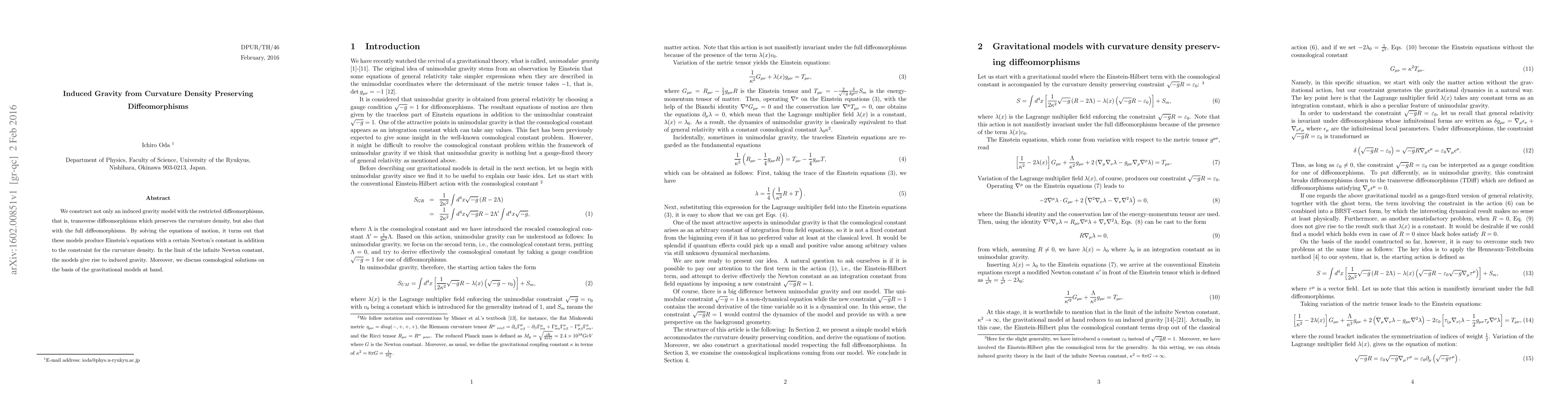 This paper constructs induced gravity models using diffeomorphisms that preserve curvature density, showing they yield Einstein's equations with a constraint for curvature density. In the limit of an infinite Newton's constant, these models lead to induced gravity, and the paper also explores cosmological solutions based on these models.
