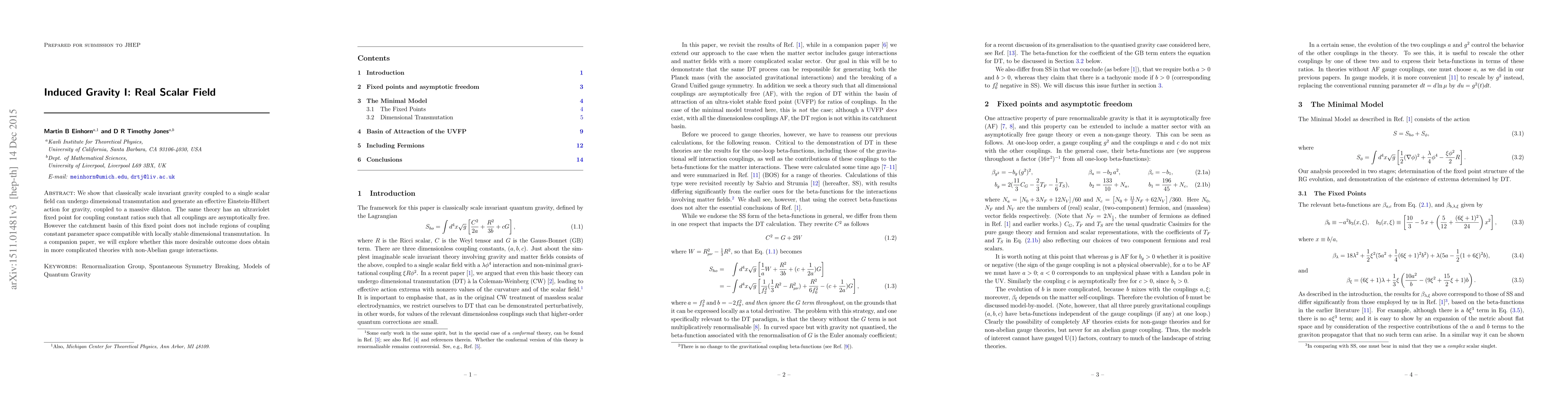 We show that classically scale invariant gravity coupled to a single scalar field can undergo dimensional transmutation and generate an effective Einstein-Hilbert action for gravity, coupled to a massive dilaton. The same theory has an ultraviolet fixed point for coupling constant ratios such that all couplings are asymptotically free. However the catchment basin of this fixed point does not include regions of coupling constant parameter space compatible with locally stable dimensional transmutation. In a companion paper we will explore whether this more desirable outcome does obtain in more complicated theories with non-Abelian gauge interactions.