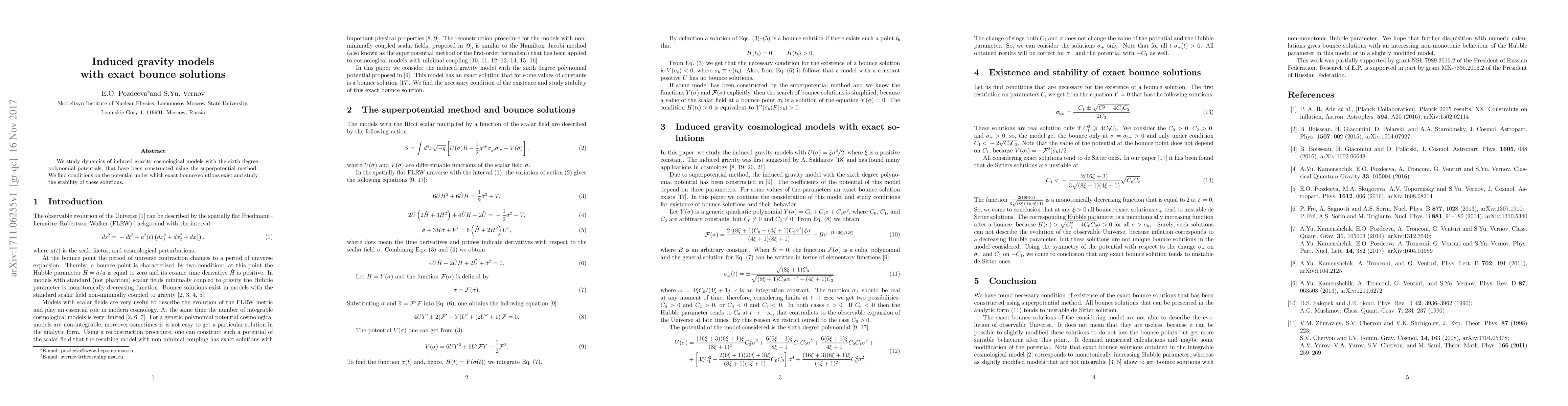 This paper investigates induced gravity cosmological models with sixth-degree polynomial potentials, constructed via the superpotential method, and identifies conditions for the existence of exact bounce solutions, while also examining their stability.