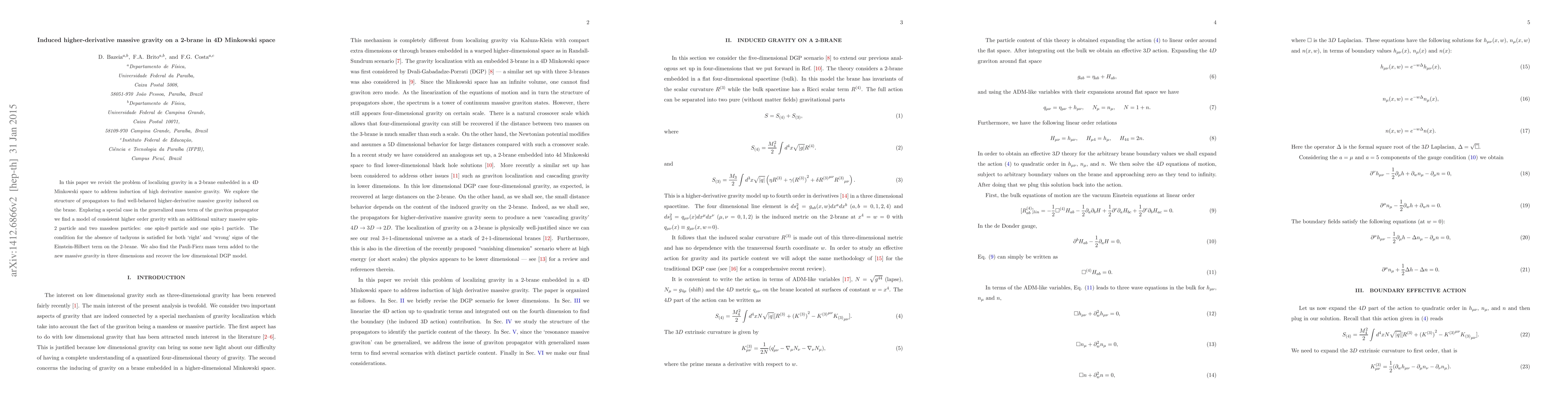This paper investigates the localization of gravity on a 2-brane in 4D Minkowski space, focusing on the induction of higher-derivative massive gravity. It proposes a consistent model featuring a unitary massive spin-2 particle alongside massless spin-0 and spin-1 particles, ensuring the absence of tachyons.