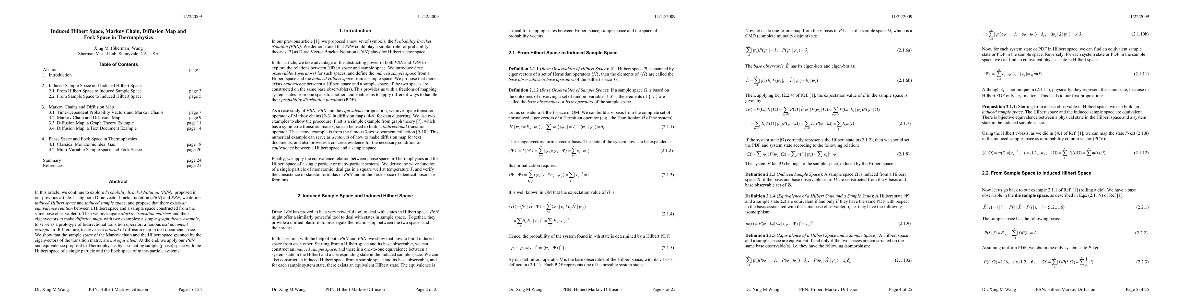 In this article, we continue to explore Probability Bracket Notation (PBN), proposed in our previous article. Using both Dirac vector bracket notation (VBN) and PBN, we define induced Hilbert space and induced sample space, and propose that there exists an equivalence relation between a Hilbert space and a sample space constructed from the same base observable(s). Then we investigate Markov transition matrices and their eigenvectors to make diffusion maps with two examples: a simple graph theory example, to serve as a prototype of bidirectional transition operator; a famous text document example in IR literature, to serve as a tutorial of diffusion map in text document space. We show that the sample space of the Markov chain and the Hilbert space spanned by the eigenvectors of the transition matrix are not equivalent. At the end, we apply our PBN and equivalence proposal to Thermophysics by associating sample (phase) space with the Hilbert space of a single particle and the Fock space of many-particle systems.