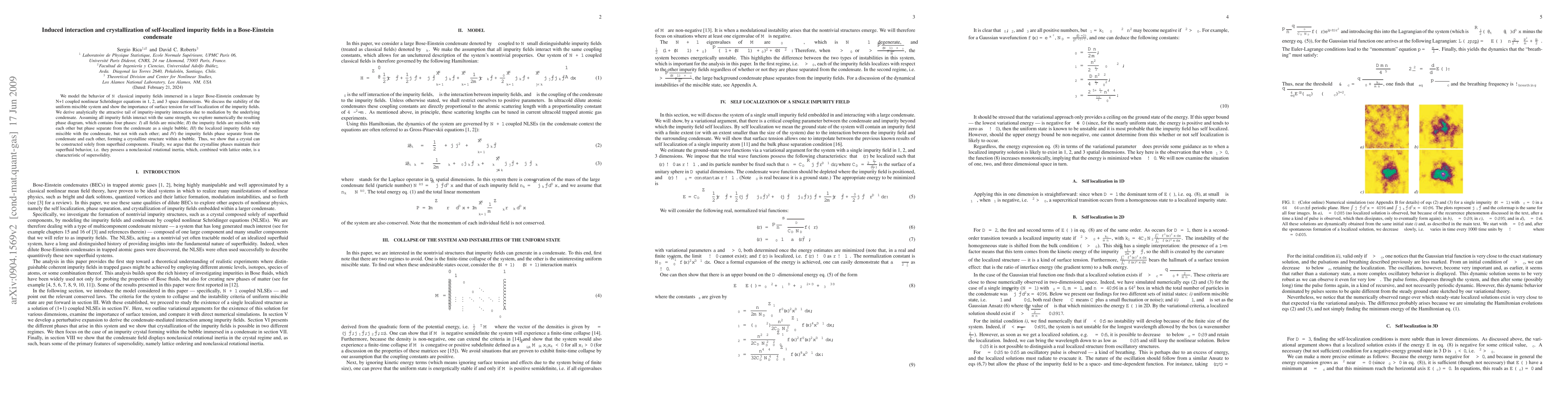 We model the behavior of N classical impurity fields immersed in a larger Bose-Einstein condensate by N+1 coupled nonlinear Schrodinger equations in 1, 2, and 3 space dimensions. We discuss the stability of the uniform miscible system and show the importance of surface tension for self localization of the impurity fields. We derive analytically the attractive tail of impurity-impurity interaction due to mediation by the underlying condensate. Assuming all impurity fields interact with the same strength, we explore the resulting phase diagram, which contains four phases: {\it I}) all fields are miscible; {\it II}) the impurity fields are miscible with each other but phase separate from the condensate as a single bubble; {\it III}) the localized impurity fields stay miscible with the condensate, but not with each other; and {\it IV}) the impurity fields phase separate from the condensate and each other, forming a crystalline structure within a bubble. Thus, we show that a crystal can be constructed solely from superfluid components. Finally, we argue that the crystalline phases maintain their superfluid behavior, i.e. they possess a nonclassical rotational inertia, which, combined with lattice order, is a characteristic of supersolidity.