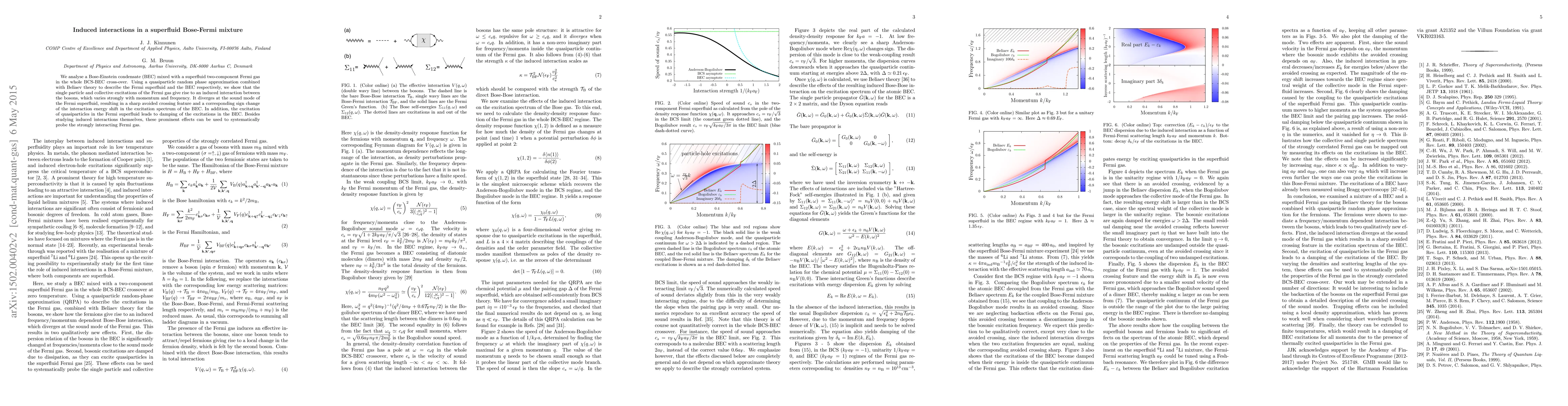 We analyse a Bose-Einstein condensate (BEC) mixed with a superfluid two-component Fermi gas in the whole BCS-BEC cross-over. Using a quasiparticle random phase approximation combined with Beliaev theory to describe the Fermi superfluid and the BEC respectively, we show that the single particle and collective excitations of the Fermi gas give rise to an induced interaction between the bosons, which varies strongly with momentum and frequency. It diverges at the sound mode of the Fermi superfluid, resulting in a sharp avoided crossing feature and a corresponding sign change of the interaction energy shift in the excitation spectrum of the BEC. In addition, the excitation of quasiparticles in the Fermi superfluid leads to damping of the excitations in the BEC. Besides studying induced interactions themselves, these prominent effects can be used to systematically probe the strongly interacting Fermi gas.