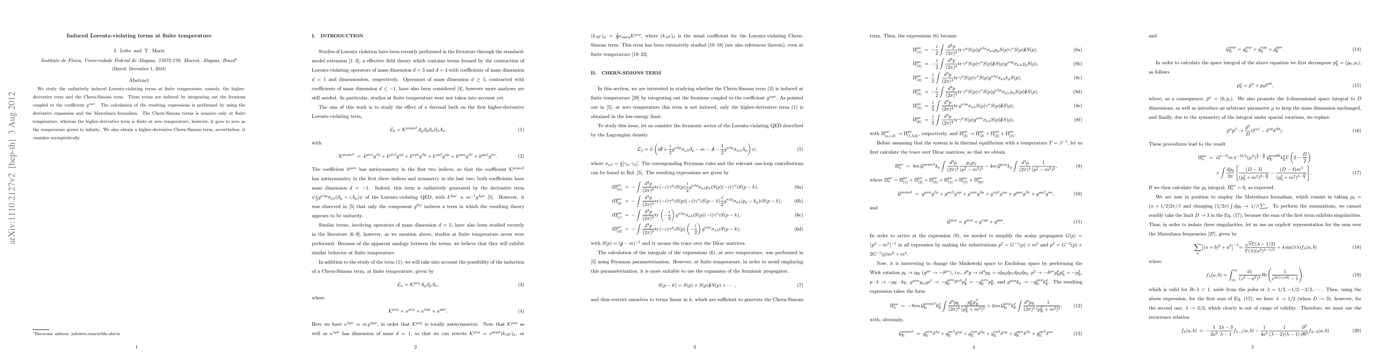 We study the radiatively induced Lorentz-violating terms at finite temperature, namely, the higher-derivative term and the Chern-Simons term. These terms are induced by integrating out the fermions coupled to the coefficient $g^{\kappa\mu\nu}$. The calculation of the resulting expressions is performed by using the derivative expansion and the Matsubara formalism. The Chern-Simons terms is nonzero only at finite temperature, whereas the higher-derivative term is finite at zero temperature, however, it goes to zero as the temperature grows to infinity. We also obtain a higher-derivative Chern-Simons term, nevertheless, it vanishes asymptotically.