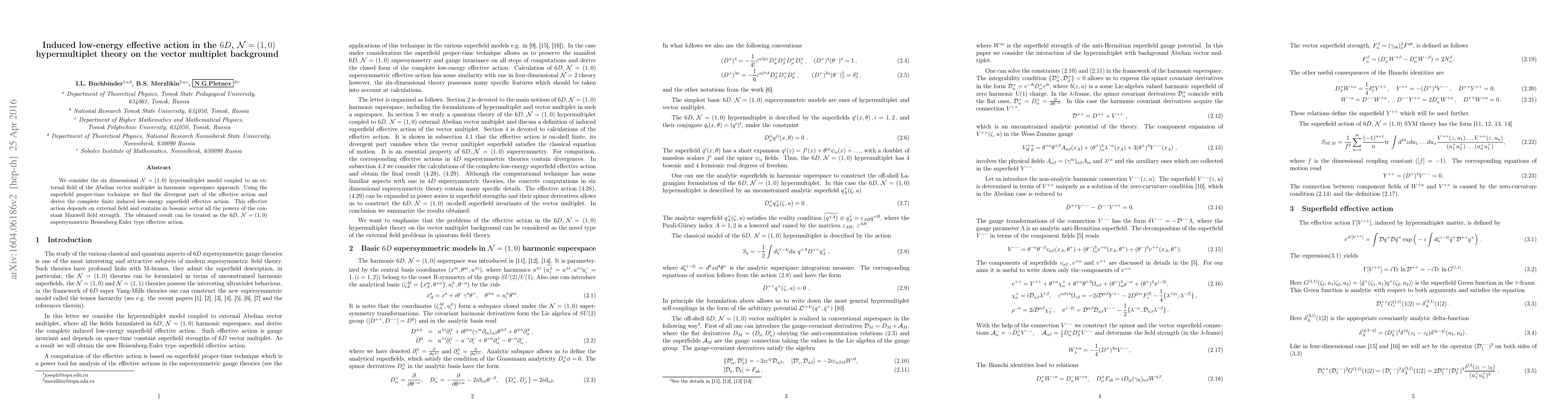Summary: The paper derives the induced low-energy effective action for a 6D N=(1,0) hypermultiplet coupled to an Abelian vector multiplet using superfield proper-time techniques, resulting in a complete finite effective action dependent on the external field that includes all bosonic powers of the constant Maxwell field strength, analogous to a supersymmetric Heisenberg-Euler effective action.