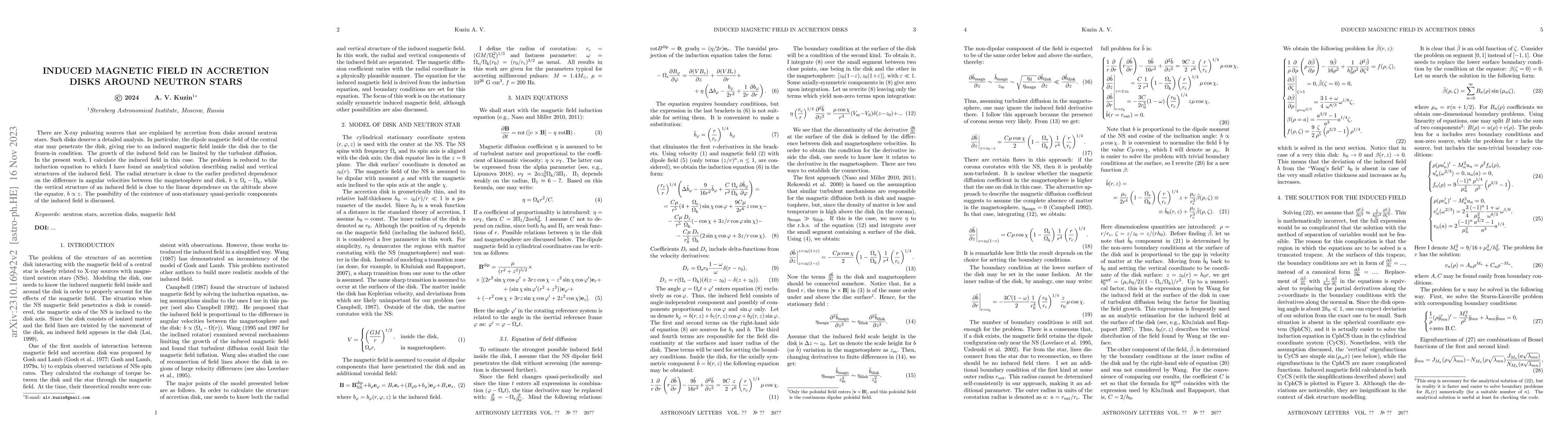 This paper investigates the induced magnetic field in accretion disks around neutron stars, finding an analytical solution to the induction equation. The induced field's radial structure correlates with angular velocity differences, while its vertical structure scales linearly with altitude, and the potential for non-stationary quasi-periodic components is considered.