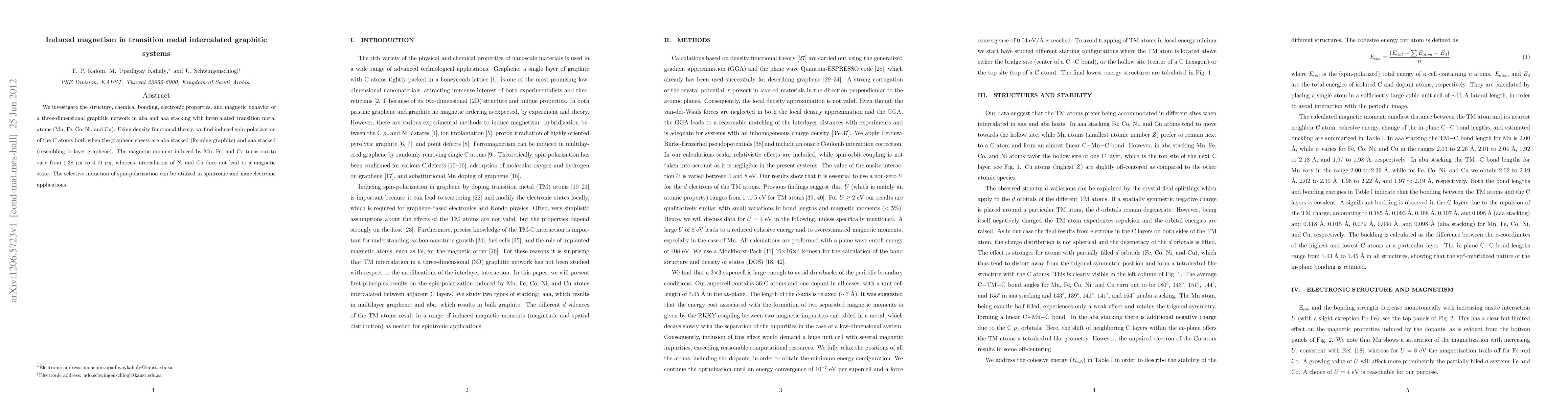 We investigate the structure, chemical bonding, electronic properties, and magnetic behavior of a three-dimensional graphitic network in aba and aaa stacking with intercalated transition metal atoms (Mn, Fe, Co, Ni, and Cu). Using density functional theory, we find induced spin-polarization of the C atoms both when the graphene sheets are aba stacked (forming graphite) and aaa stacked (resembling bi-layer graphene). The magnetic moment induced by Mn, Fe, and Co turns out to vary from 1.38 {\mu}B to 4.10 {\mu}B, whereas intercalation of Ni and Cu does not lead to a magnetic state. The selective induction of spin-polarization can be utilized in spintronic and nanoelectronic applications.