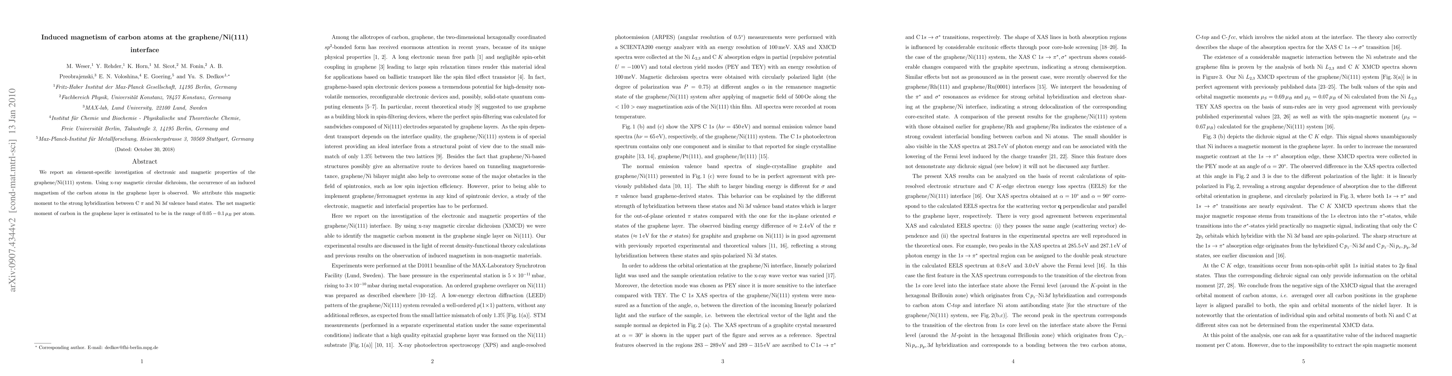 The paper presents a detailed analysis of the electronic and magnetic properties of the graphene/Ni(111) system, attributing the induced magnetism to strong C π - Ni 3d hybridization.