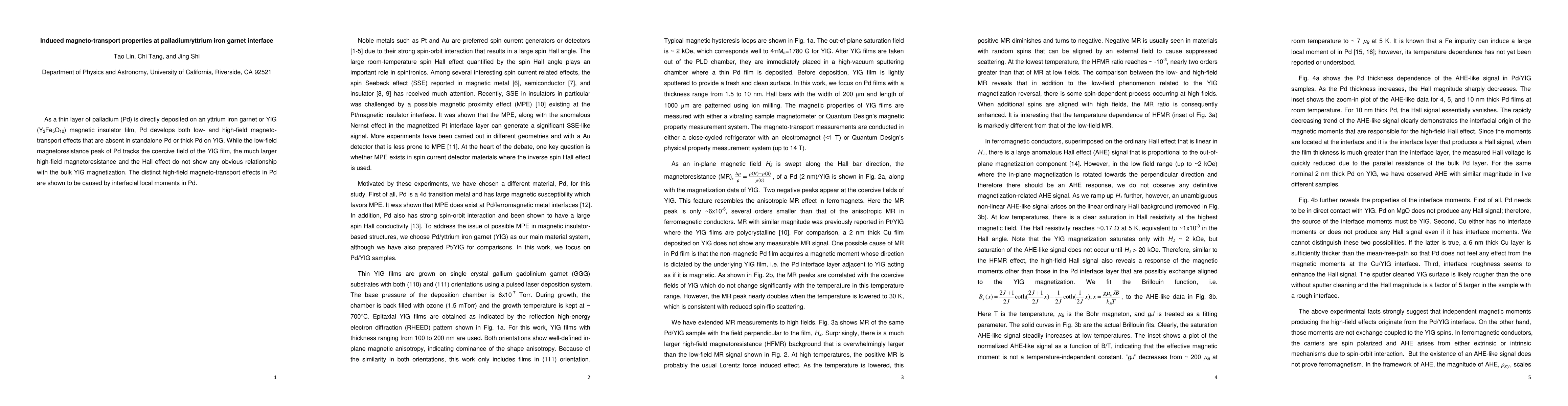 This study investigates the magneto-transport properties at the interface between palladium (Pd) and yttrium iron garnet (YIG), revealing unique low- and high-field effects absent in standalone Pd. The low-field magnetoresistance correlates with YIG's coercive field, while high-field magnetoresistance and the Hall effect are attributed to interfacial local moments in Pd.