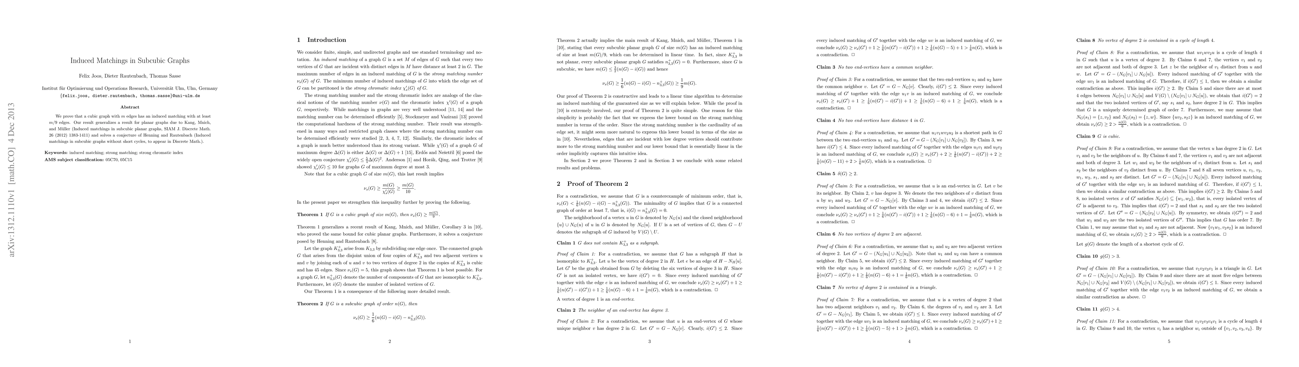 Summary: This paper demonstrates that cubic graphs with $m$ edges contain an induced matching of at least $m/9$ edges, extending a previous result for planar subcubic graphs and resolving a conjecture regarding subcubic graphs without short cycles.