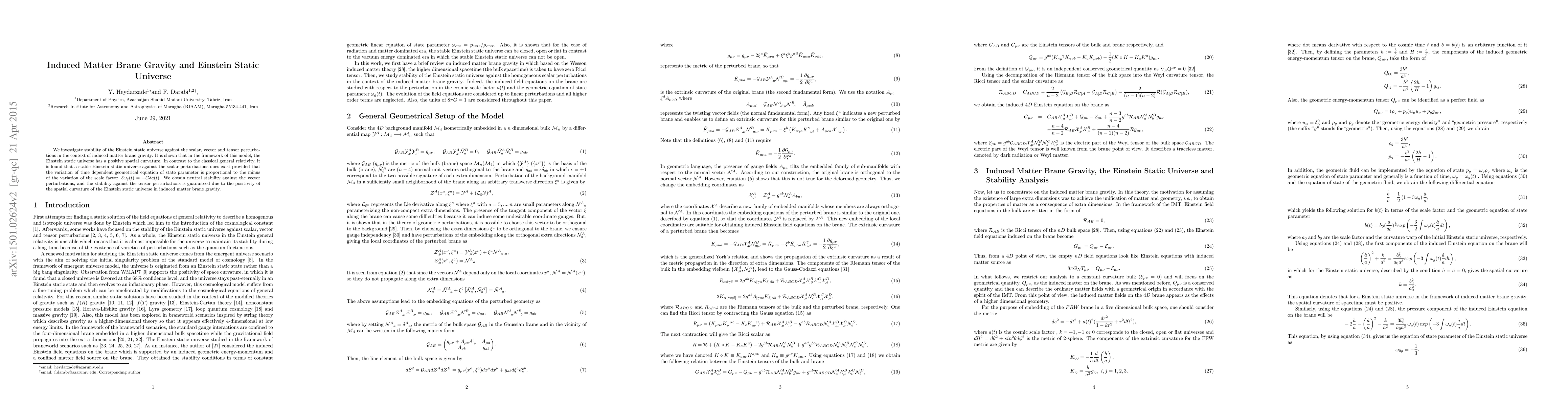 This paper explores the stability of the Einstein static universe under scalar, vector, and tensor perturbations within induced matter brane gravity, revealing a stable universe with positive spatial curvature. It finds neutral stability against vector perturbations and stability against tensor perturbations due to the spatial curvature.