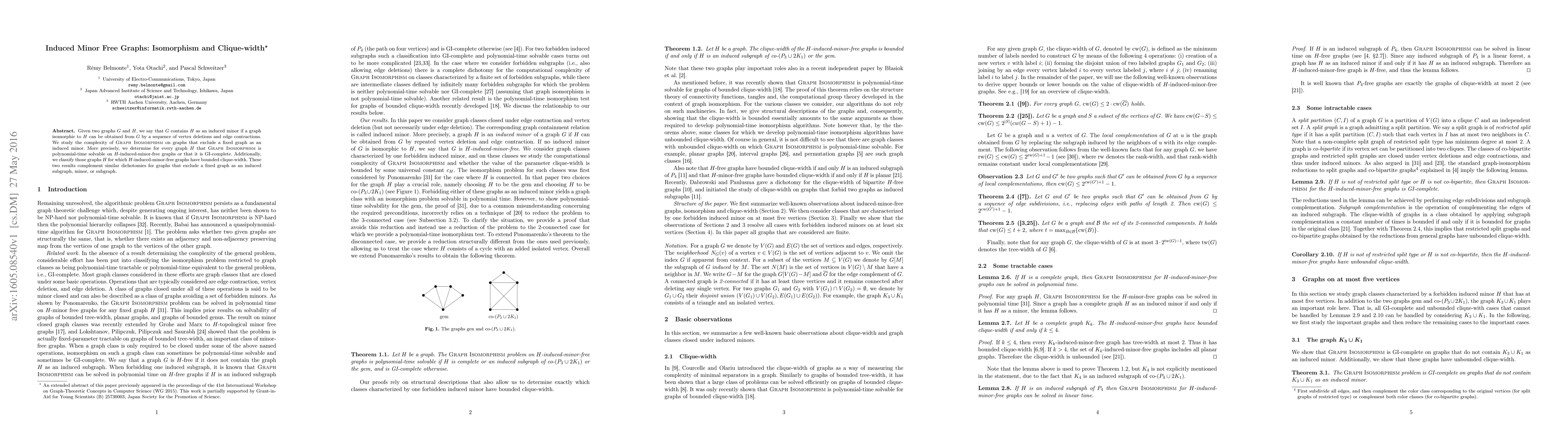 This paper investigates the complexity of Graph Isomorphism on graphs that exclude a fixed graph as an induced minor, determining whether it is polynomial-time solvable or GI-complete. It also classifies graphs for which such graphs have bounded clique-width, complementing similar studies on induced subgraphs, minors, and subgraphs.