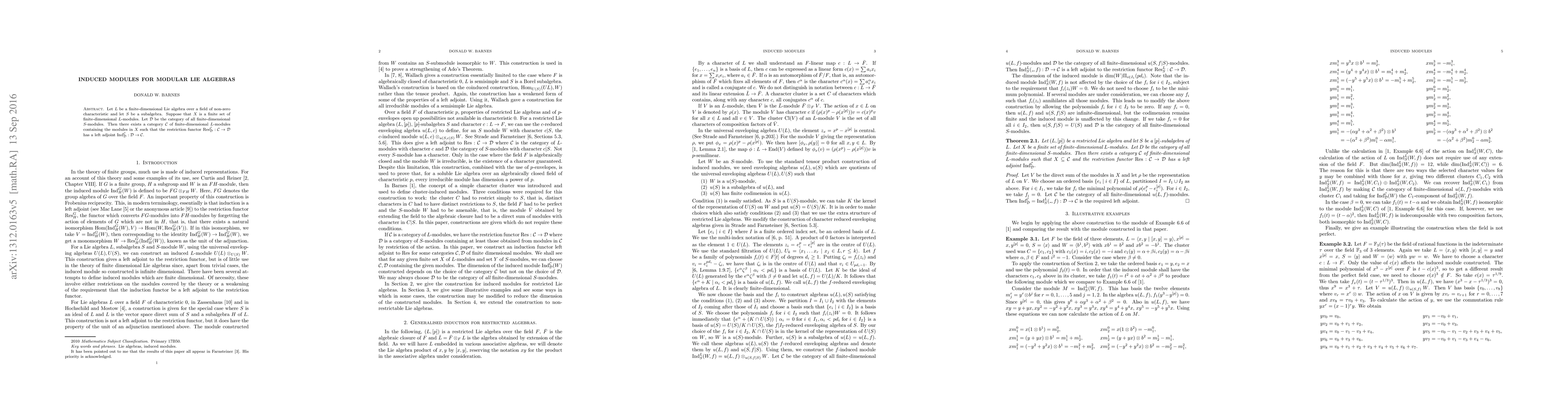 Researchers show that for a finite-dimensional Lie algebra L and its subalgebra S, there exists a category C of L-modules containing a set X of modules such that the restriction functor has a left adjoint, Ind, allowing for the creation of new modules from existing ones in X.