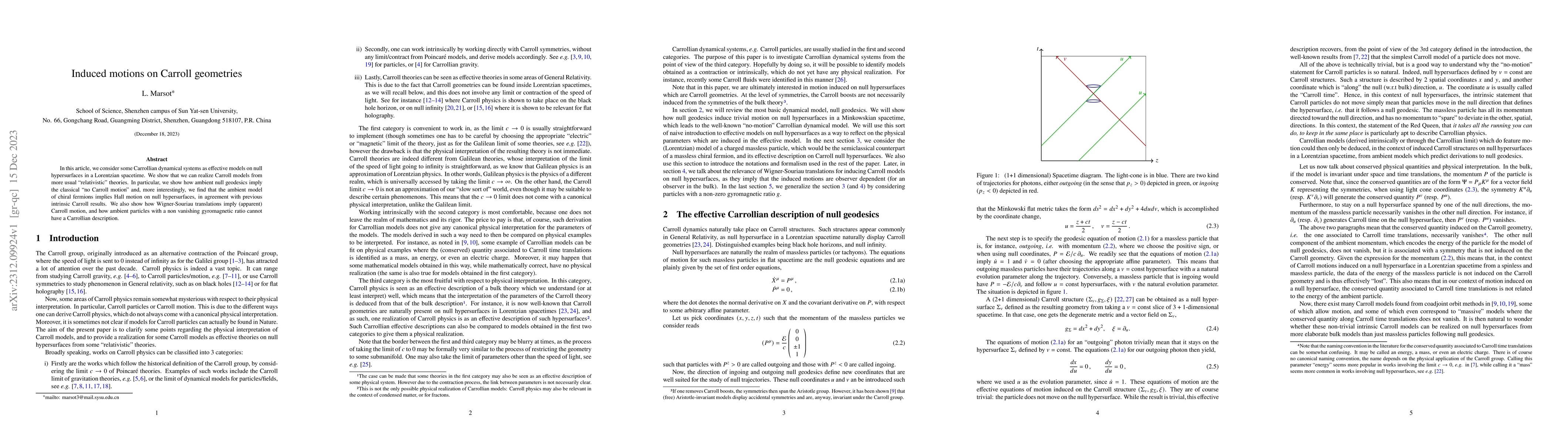 This paper explores Carrollian dynamical systems on null hypersurfaces derived from Lorentzian spacetimes, demonstrating that ambient null geodesics lead to "no Carroll motion" and that chiral fermion models exhibit Hall motion, aligning with intrinsic Carroll results. It also shows how Wigner-Souriau translations induce apparent Carroll motion and discusses the limitations of Carrollian descriptions for particles with non-vanishing gyromagnetic ratios.