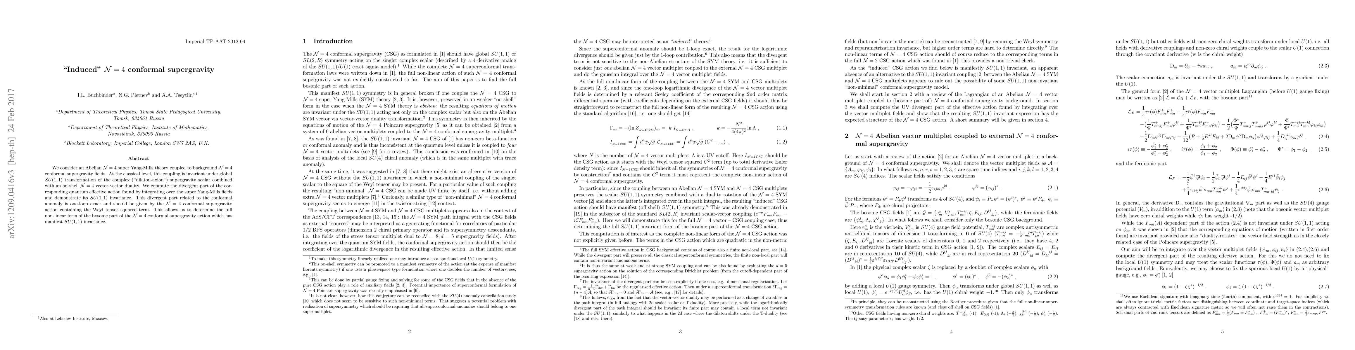 This paper investigates the coupling of abelian N=4 super Yang-Mills theory to N=4 conformal supergravity, proving classical and quantum invariance under SU(1,1) transformations. It determines the full non-linear bosonic part of the N=4 conformal supergravity action, confirming the presence of the Weyl tensor squared term.