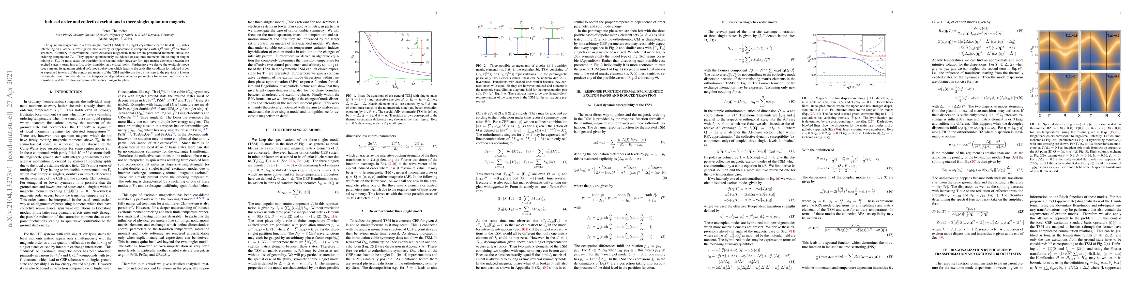 The quantum magnetism in a three-singlet model (TSM) with singlet crystalline electric field (CEF) states interacting on a lattice is investigated, motivated by its appearance in compounds with 4f^2 and 5f^2 electronic structure. Contrary to conventional (semi-classical) magnetism there are no preformed moments above the ordering temperature Tm. They appear spontaneously as induced or excitonic moments due to singlet-singlet mixing at Tm. In most cases the transition is of second order, however for large matrix elements between the excited states it turns into a first order transition at a critical point. Furthermore we derive the excitonic mode spectrum and its quantum critical soft mode behaviour which leads to the criticality condition for induced order as expressed in terms of the control parameters of the TSM and discuss the distinctions to the previously known two-singlet case. We also derive the temperature dependence of order parameters for second and first order transitions and the exciton spectrum in the induced magnetic phase.