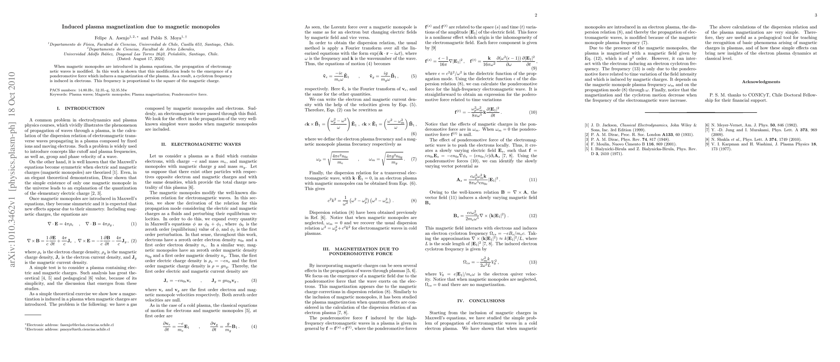 The introduction of magnetic monopoles in plasma equations leads to a ponderomotive force that induces magnetization, resulting in an induced cyclotron frequency proportional to the square of the magnetic charge.