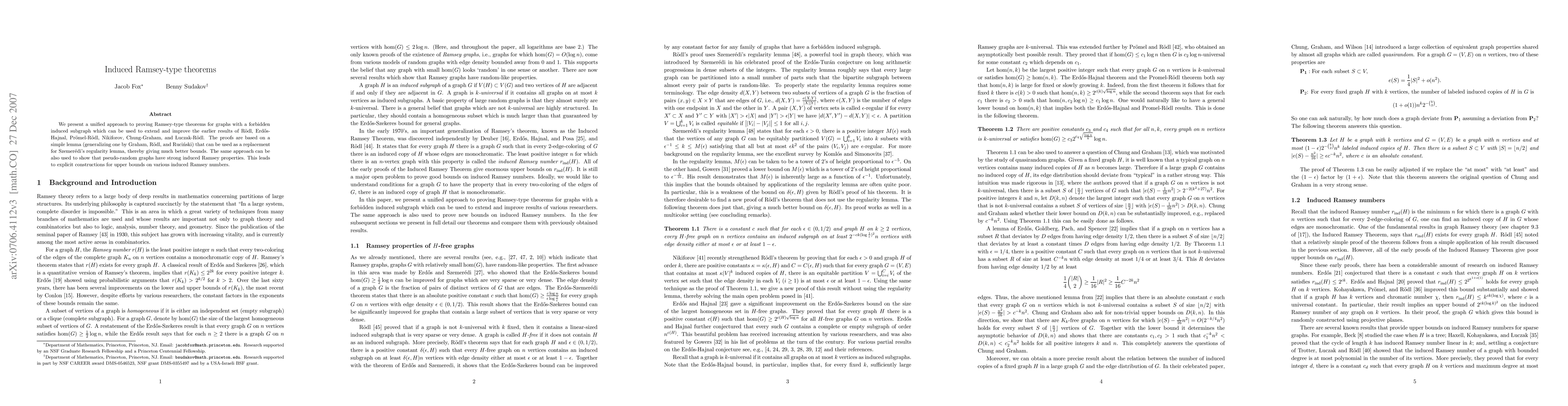 This paper introduces a unified method to extend and enhance earlier Ramsey-type theorems for graphs by focusing on induced subgraphs, using a simple lemma to replace Szemerédi's regularity lemma for better bounds and constructions of pseudo-random graphs with strong induced Ramsey properties.