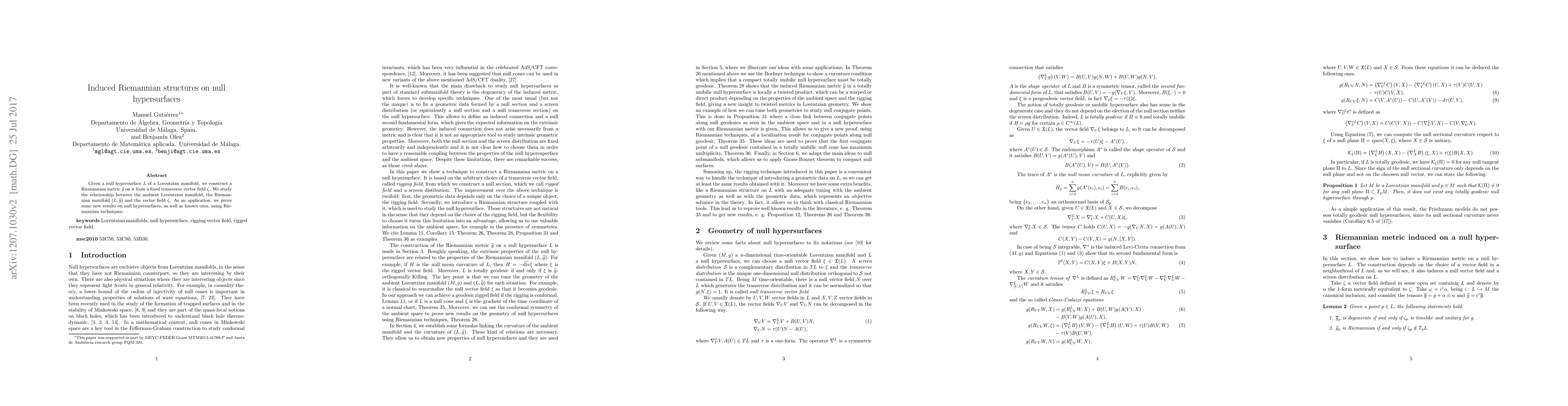 This paper constructs a Riemannian metric on a null hypersurface from a transverse vector field and explores its relationship with the ambient Lorentzian manifold, applying Riemannian techniques to derive new results on null hypersurfaces.