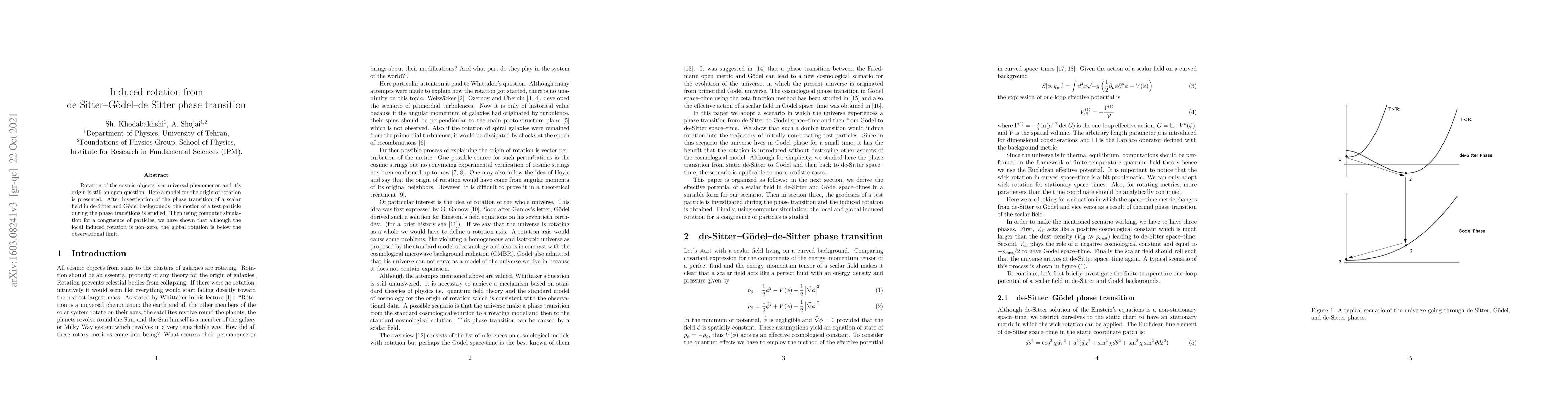Therotationofthecosmicobjectsisauniversalphenomenonanditsoriginisstillanopenquestion.Here a model for the origin of rotation is presented. After an investigation of the phase transition of a scalar field in de Sitter and G\"odel backgrounds, the motion of a test particle during the phase transitions is studied. Then using computer simulation for a congruence of particles, we show that although the local induced rotation is nonzero, the global rotation is below the observational limit.