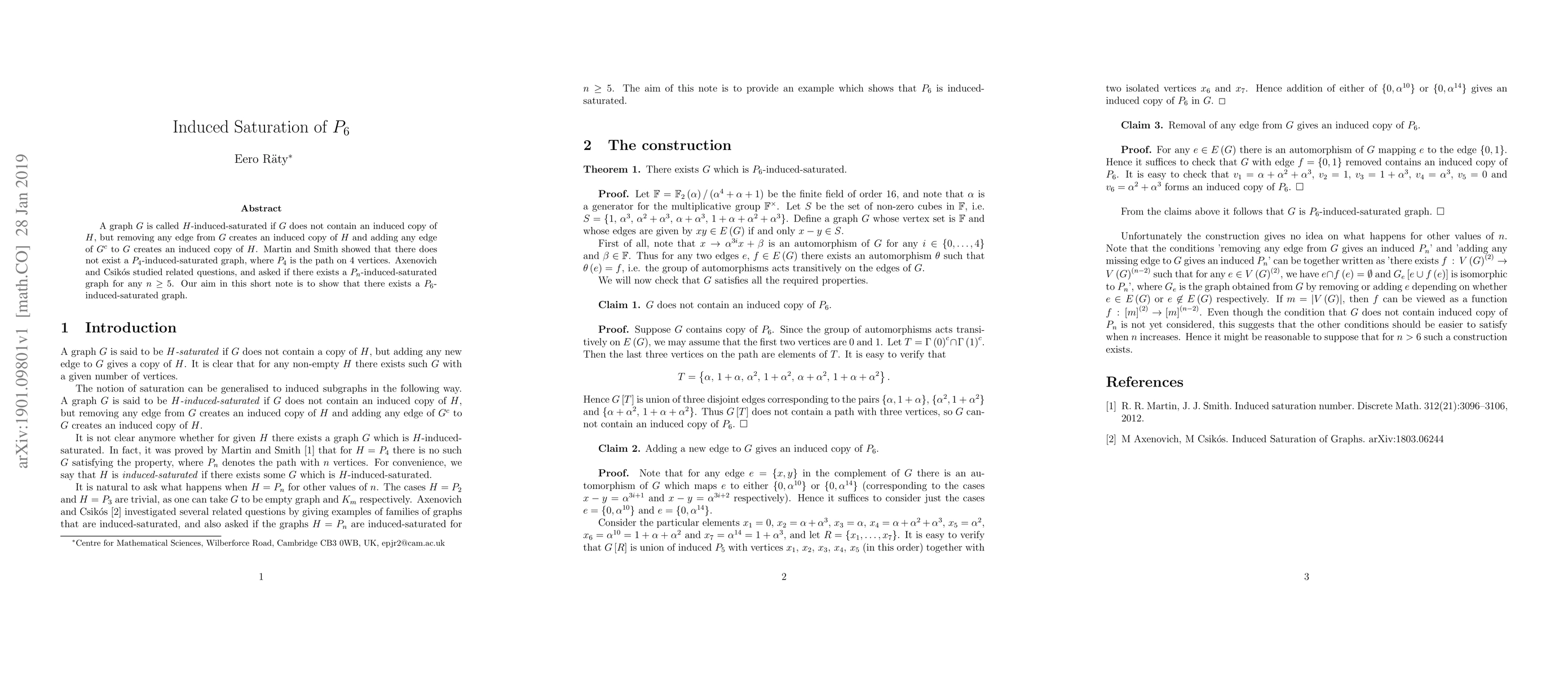 A graph $G$ is called $H$-induced-saturated if $G$ does not contain an induced copy of $H$, but removing any edge from $G$ creates an induced copy of $H$ and adding any edge of $G^{c}$ to $G$ creates an induced copy of $H$. Martin and Smith showed that there does not exist a $P_{4}$-induced-saturated graph, where $P_{4}$ is the path on 4 vertices. Axenovich and Csik\'os studied related questions, and asked if there exists a $P_{n}$-induced-saturated graph for any $n\geq5$. Our aim in this short note is to show that there exists a $P_{6}$-induced-saturated graph.