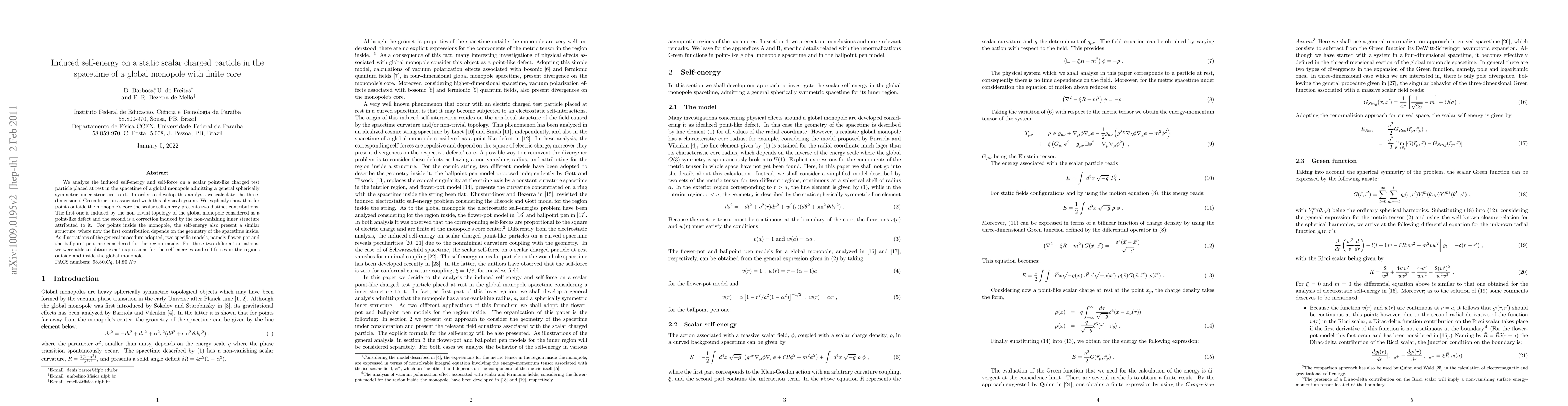 This paper investigates the self-energy and self-force on a static scalar charged particle in the spacetime of a global monopole with a finite core. It reveals two distinct contributions to the scalar self-energy: one from the monopole's topological defect and another from its inner structure, with exact expressions obtained for specific models.