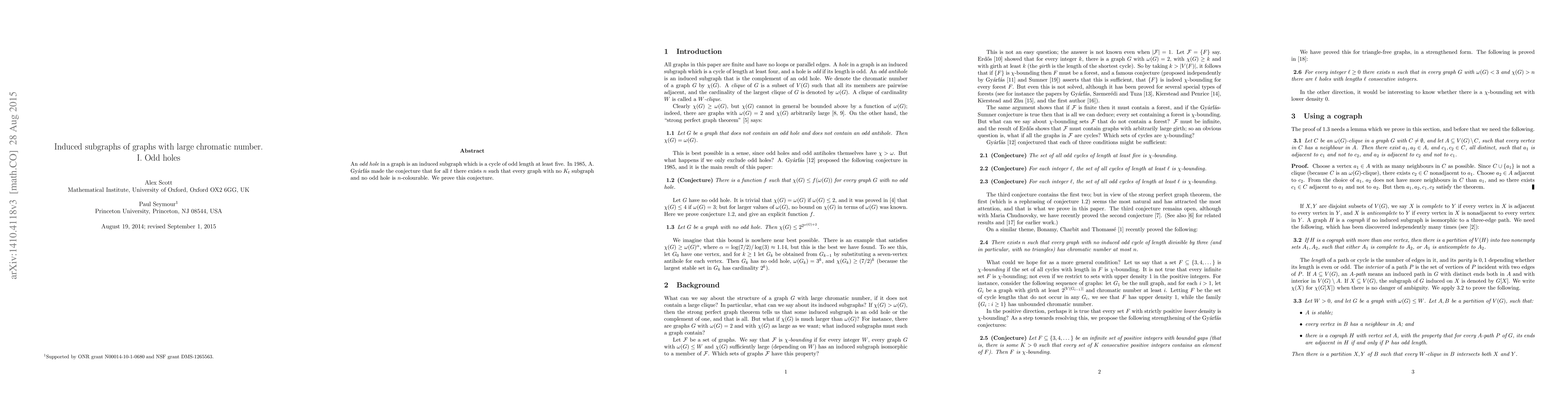 An odd hole in a graph is an induced subgraph which is a cycle of odd length at least five. In 1985, A. Gyarfas made the conjecture that for all t there exists n such that every graph with no K_t subgraph and no odd hole is n-colourable. We prove this conjecture.