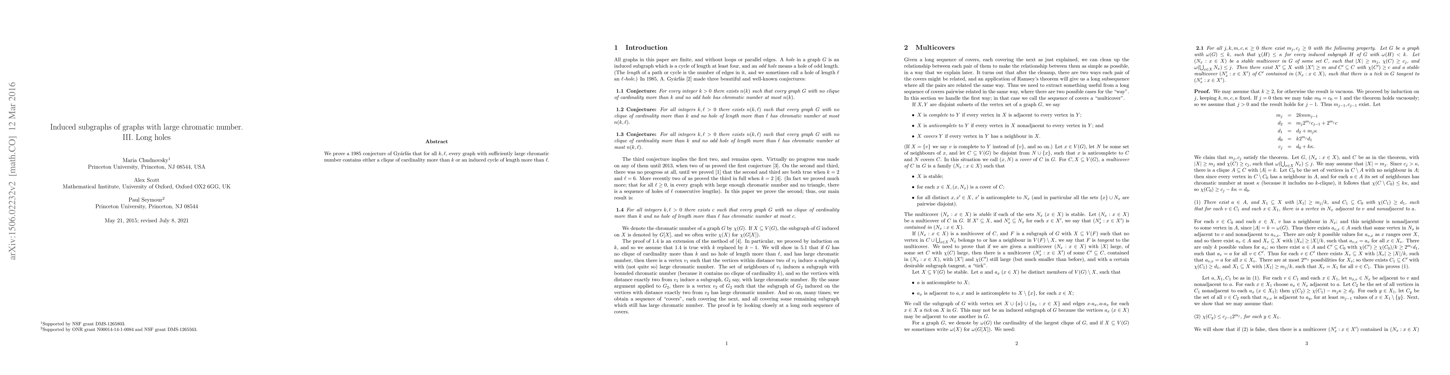 This research proves a 1985 conjecture that every graph with large chromatic number contains either a complete subgraph of k vertices or an induced cycle of length at least ε.