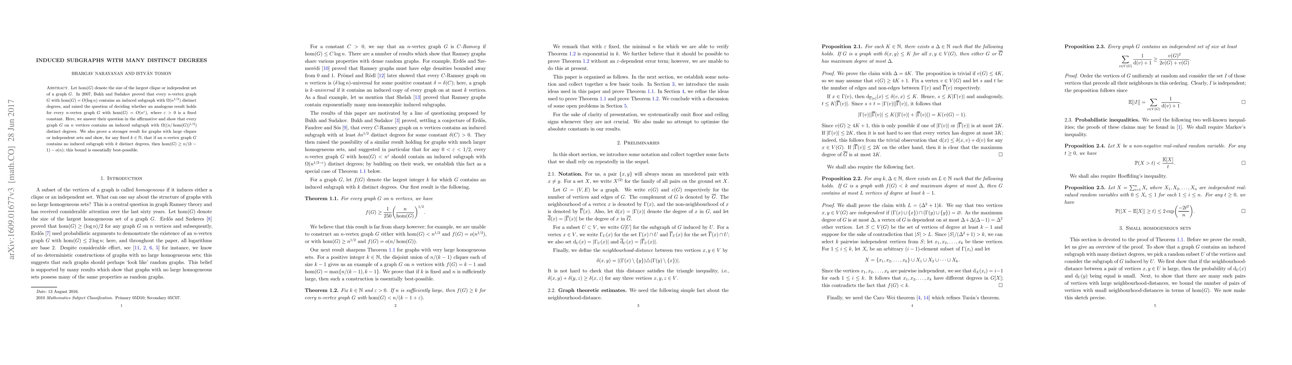 Let $\hom(G)$ denote the size of the largest clique or independent set of a graph $G$. In 2007, Bukh and Sudakov proved that every $n$-vertex graph $G$ with $\hom(G) = O(\log n)$ contains an induced subgraph with $\Omega(n^{1/2})$ distinct degrees, and raised the question of deciding whether an analogous result holds for every $n$-vertex graph $G$ with $\hom(G) = O(n^\epsilon)$, where $\epsilon > 0$ is a fixed constant. Here, we answer their question in the affirmative and show that every graph $G$ on $n$ vertices contains an induced subgraph with $\Omega((n/\hom(G))^{1/2})$ distinct degrees. We also prove a stronger result for graphs with large cliques or independent sets and show, for any fixed $k \in \mathbb{N}$, that if an $n$-vertex graph $G$ contains no induced subgraph with $k$ distinct degrees, then $\hom(G) \ge n/(k-1)-o(n)$; this bound is essentially best-possible.