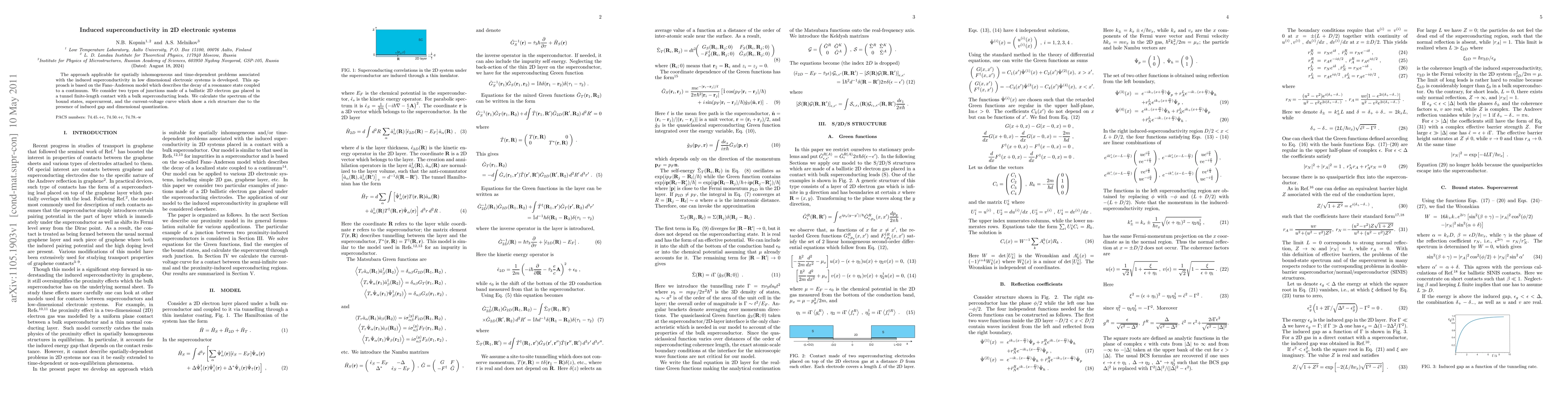 The approach applicable for spatially inhomogeneous and time-dependent problems associated with the induced superconductivity in low dimensional electronic systems is developed. This approach is based on the Fano--Anderson model which describes the decay of a resonance state coupled to a continuum. We consider two types of junctions made of a ballistic 2D electron gas placed in a tunnel finite-length contact with a bulk superconducting leads. We calculate the spectrum of the bound states, supercurrent, and the current-voltage curve which show a rich structure due to the presence of induced gap and dimensional quantization.