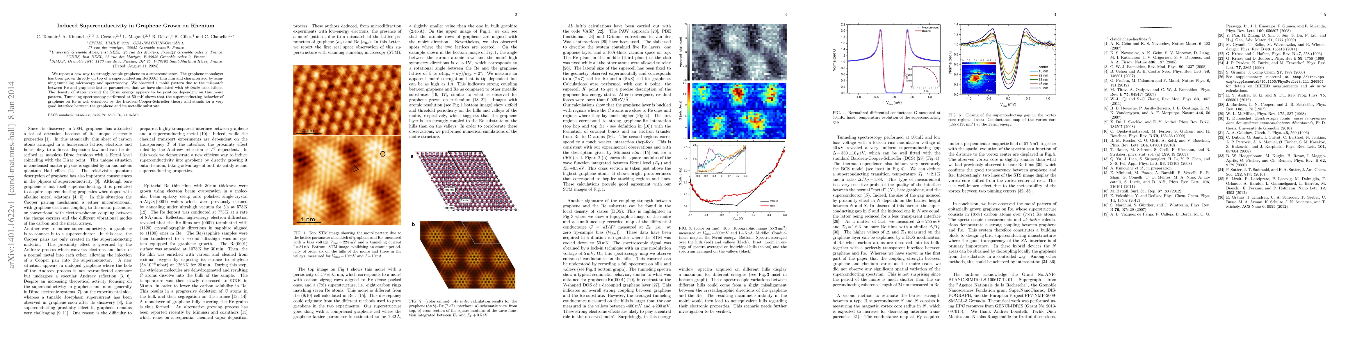 We report a new way to strongly couple graphene to a superconductor. The graphene monolayer has been grown directly on top of a superconducting Re(0001) thin film and characterized by scanning tunneling microscopy and spectroscopy. We observed a moir\'e pattern due to the mismatch between Re and graphene lattice parameters that we have simulated with ab initio calculations. The density of states around the Fermi energy appears to be position dependent on this moir\'e pattern. Tunneling spectroscopy performed at 50 mK shows that the superconducting behavior of graphene on Re is well described by the Bardeen-Cooper-Schrieffer theory and stands for a very good interface between the graphene and its metallic substrate.