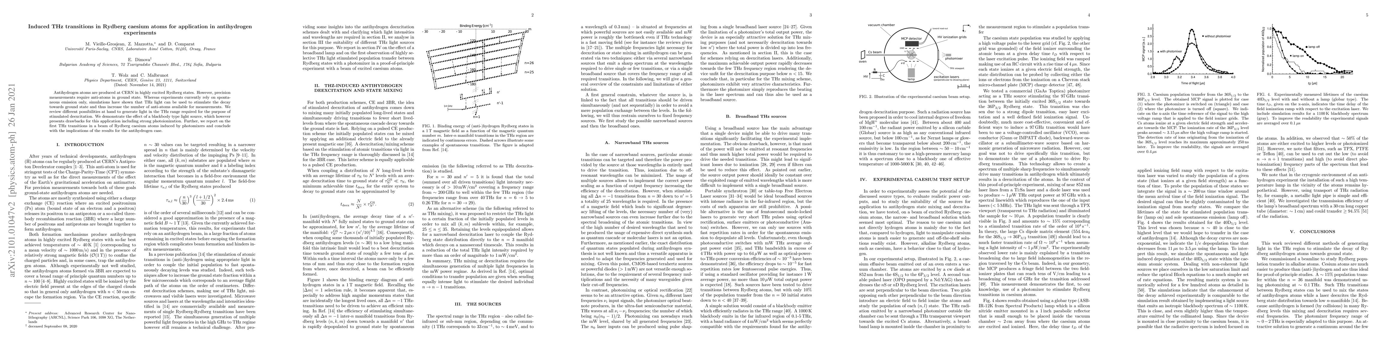The paper discusses using Terahertz (THz) light to stimulate Rydberg antihydrogen atoms' decay to ground state for precision measurements at CERN. It reviews THz light generation methods, demonstrates the effect of a blackbody light source's drawbacks, and reports the first THz transitions in a beam of Rydberg caesium atoms induced by photomixers, with implications for antihydrogen experiments.