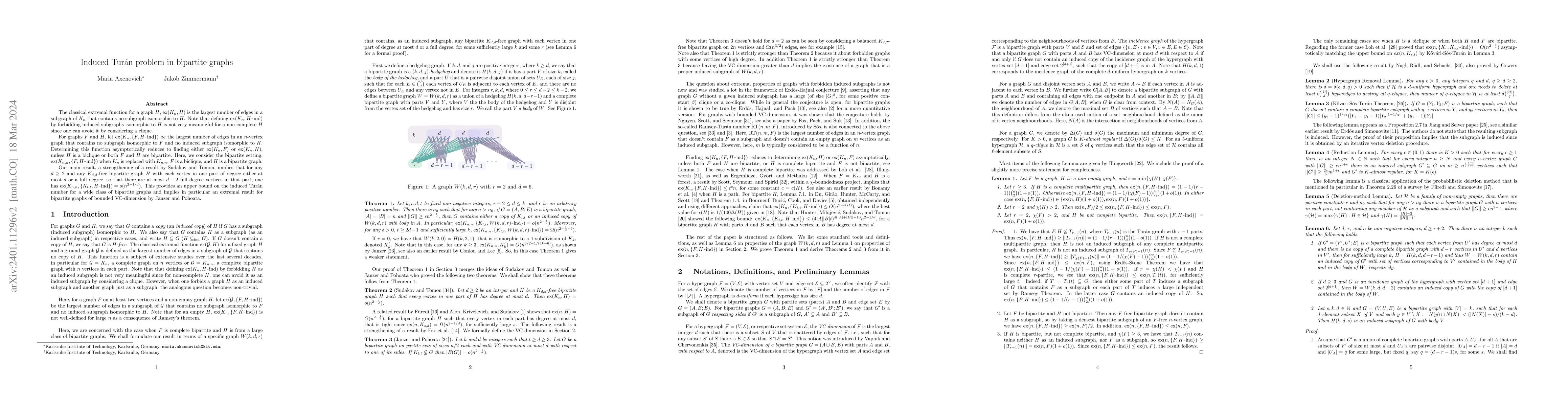 The classical extremal function for a graph $H$, $ex(K_n, H)$ is the largest number of edges in a subgraph of $K_n$ that contains no subgraph isomorphic to $H$. Note that defining $ex(K_n, H-ind)$ by forbidding induced subgraphs isomorphic to $H$ is not very meaningful for a non-complete $H$ since one can avoid it by considering a clique. For graphs $F$ and $H$, let $ex(K_n, \{F, H-ind\})$ be the largest number of edges in an $n$-vertex graph that contains no subgraph isomorphic to $F$ and no induced subgraph isomorphic to $H$. Determining this function asymptotically reduces to finding either $ex(K_n, F)$ or $ex(K_n, H)$, unless $H$ is a biclique or both $F$ and $H$ are bipartite. Here, we consider the bipartite setting, $ex(K_{n,n}, \{F, H-ind\})$ when $K_n$ is replaced with $K_{n,n}$, $F$ is a biclique, and $H$ is a bipartite graph. Our main result, a strengthening of a result by Sudakov and Tomon, implies that for any $d\geq 2$ and any $K_{d,d}$-free bipartite graph $H$ with each vertex in one part of degree either at most $d$ or a full degree, so that there are at most $d-2$ full degree vertices in that part, one has $ex(K_{n,n}, \{K_{t,t}, H-ind\}) = o(n^{2-1/d})$. This provides an upper bound on the induced Tur\'an number for a wide class of bipartite graphs and implies in particular an extremal result for bipartite graphs of bounded VC-dimension by Janzer and Pohoata.
